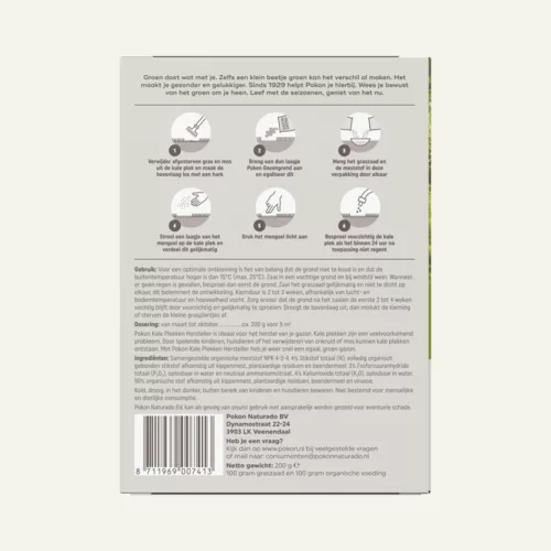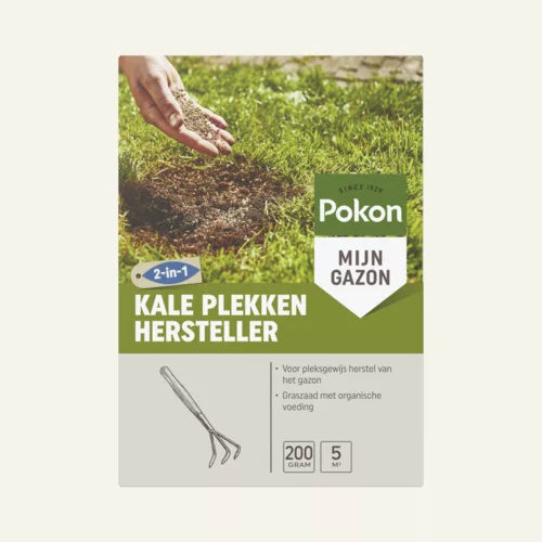 Het graszaad is een speciaal mengsel met een coating dat op testvelden in Nederland en het buitenland is getest. Het mengsel bevat verschillenden soorten graszaad. Het zaad dat zich het beste thuis voelt in jouw type gazon zal het eerst opkomen en daarmee de overige soorten verdringen. Zo vult Pokon Kale Plekken Hersteller in alle typen gazons de kale plekken mooi op. De coating voorkomt dat de zaadjes wegwaaien of wegspoelen, ook houdt de coating water beter vast. Hierdoor kiemen de zaadjes in 1 tot 3 weken (afhankelijk van de weersomstandigheden).