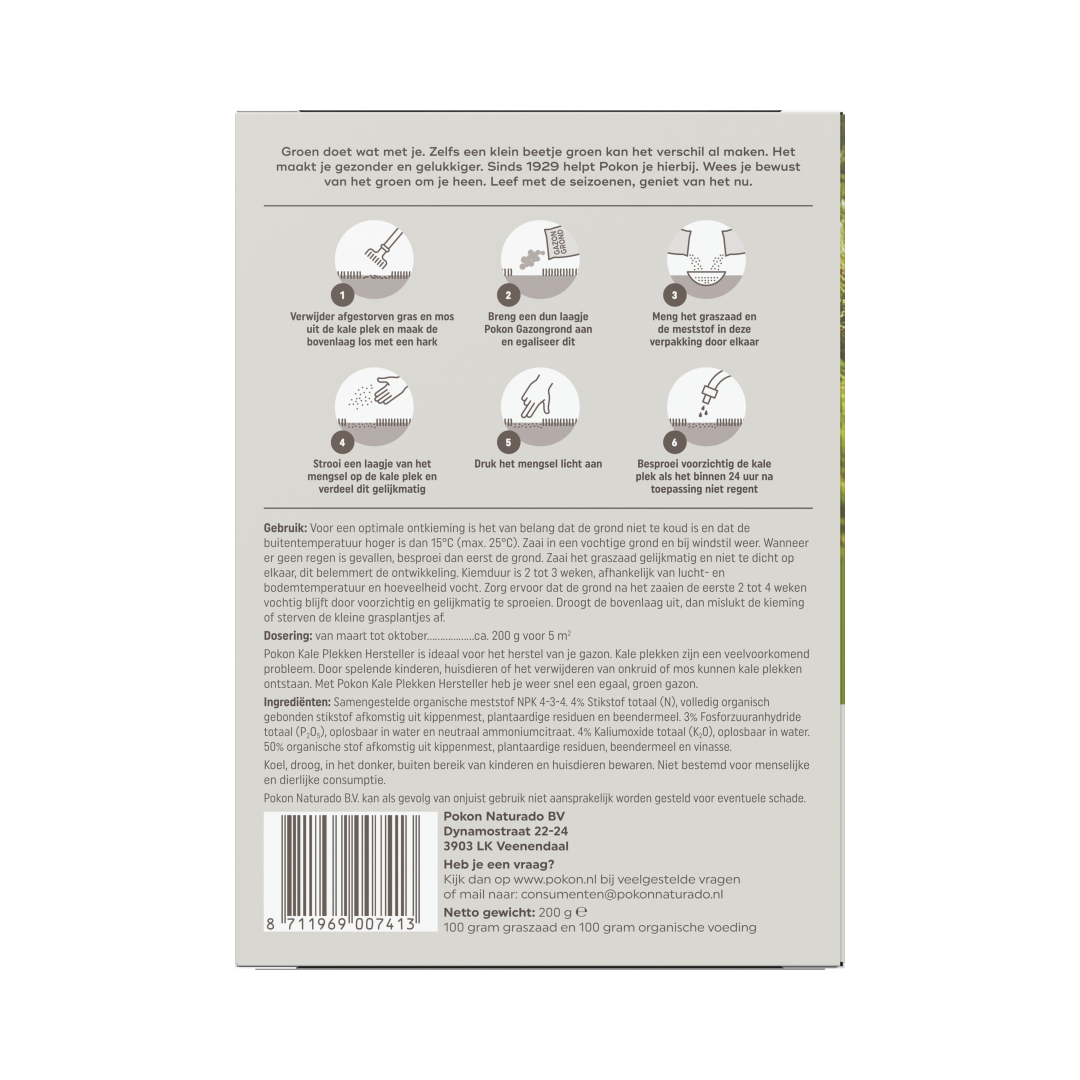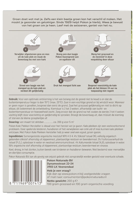 Het graszaad is een speciaal mengsel met een coating dat op testvelden in Nederland en het buitenland is getest. Het mengsel bevat verschillenden soorten graszaad. Het zaad dat zich het beste thuis voelt in jouw type gazon zal het eerst opkomen en daarmee de overige soorten verdringen. Zo vult Pokon Kale Plekken Hersteller in alle typen gazons de kale plekken mooi op. De coating voorkomt dat de zaadjes wegwaaien of wegspoelen, ook houdt de coating water beter vast. Hierdoor kiemen de zaadjes in 1 tot 3 weken (afhankelijk van de weersomstandigheden).
