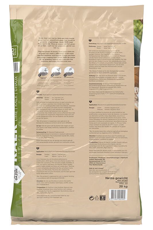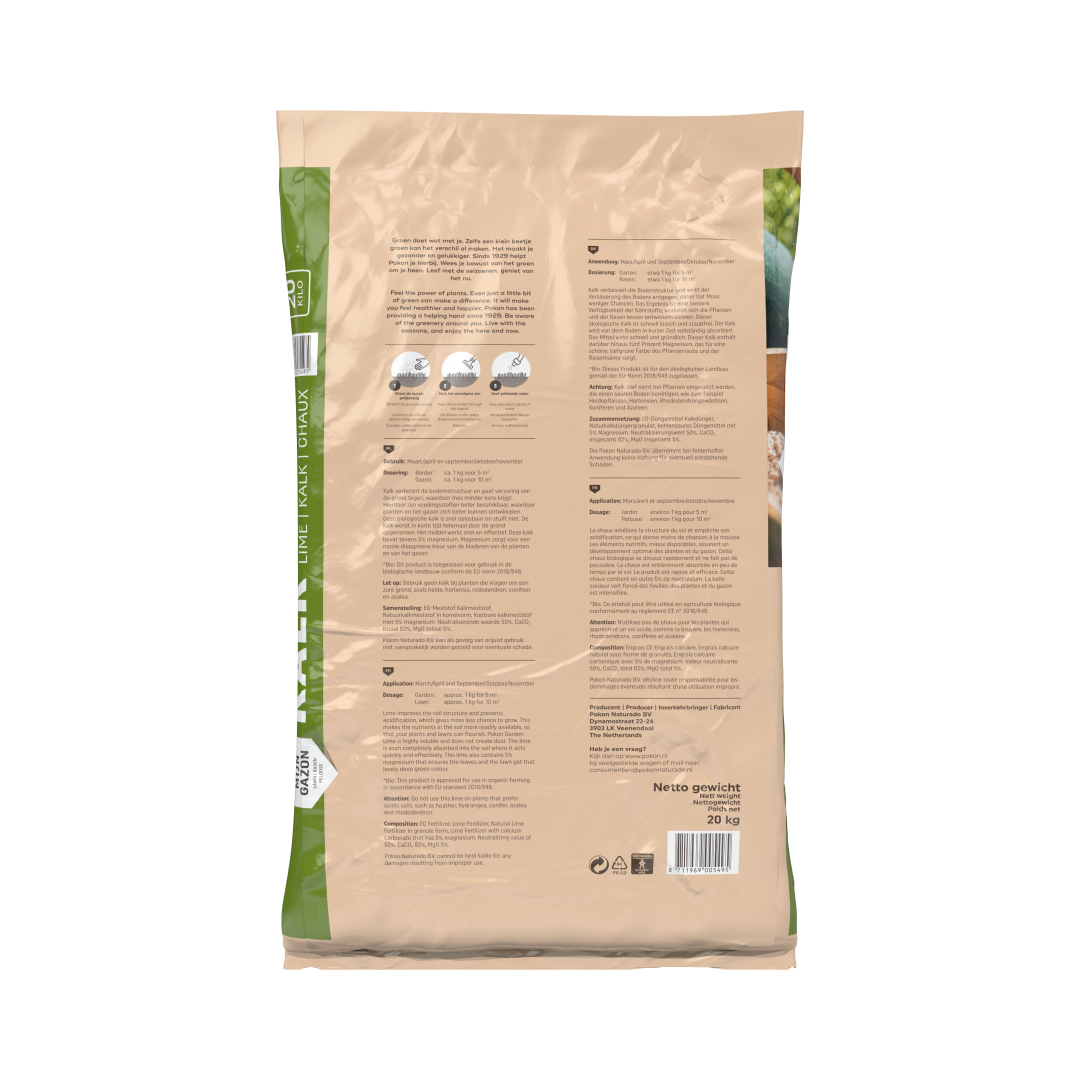 Pokon Bio Kalk verbetert de bodemstructuur en gaat verzuring van de grond tegen. Hierdoor zijn voedingsstoffen beter beschikbaar, waardoor planten en het gazon beter kunnen ontwikkelen. Pokon Bio Kalk is snel oplosbaar en stuift niet. De kalk wordt in korte tijd helemaal door de grond opgenomen. Het middel werkt snel en effectief. Door kalk op het gazon te strooien, wordt mosvorming voorkomen. Deze kalk bevat daarnaast 5% magnesium. Magnesium geeft extra voeding aan je planten en zorgt voor een mooie diep groene kleur van de bladeren van de planten en van het gazon.