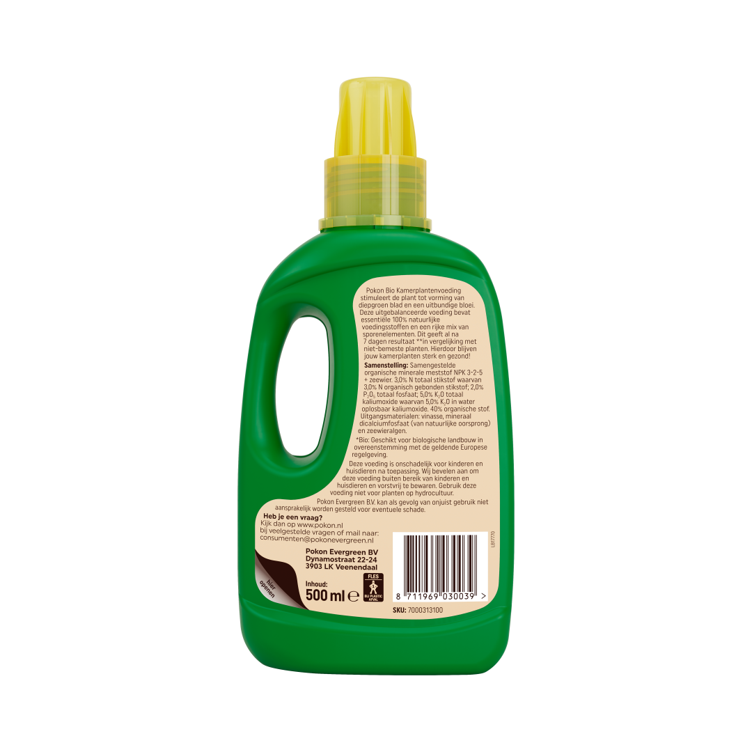 Pokon Bio Kamerplanten Voeding is een samengestelde organisch minerale meststof (NPK 3-2-5) + zeewier.