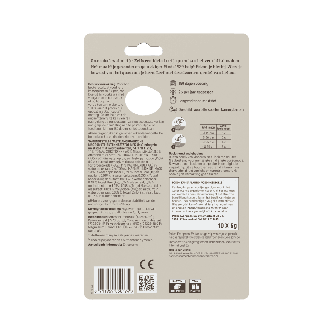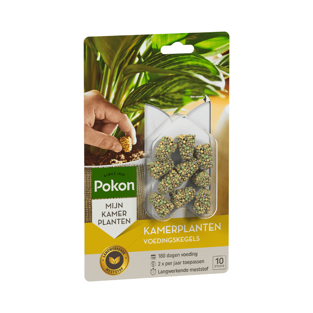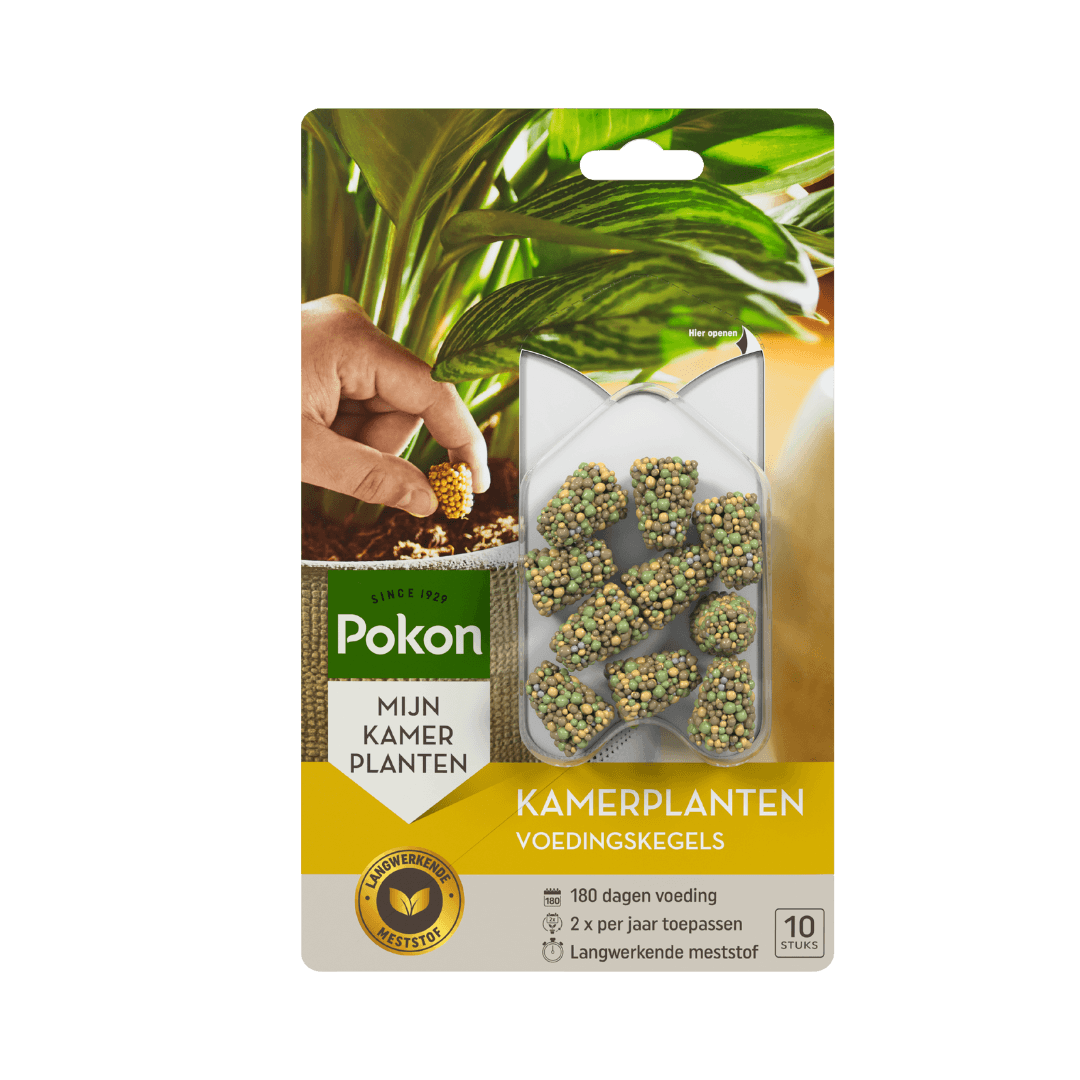 Geef je kamerplanten het hele jaar door de beste verzorging met Pokon Kamerplanten Voedingskegels! Deze slimme kegels geven geleidelijk voeding af, precies wanneer je planten het nodig hebben. Dankzij de speciale Osmocote® coating werken de kegels tot wel 180 dagen, onder invloed van vocht en temperatuur. Zo blijven je planten gezond, stevig en prachtig groen.
