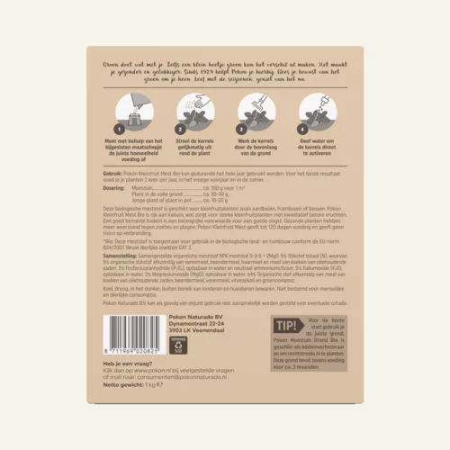 Pokon Bio Kleinfruit Mest bestaat uit een samengestelde organische NPK-meststof 5-3-5 + 2MgO. Deze meststof is toegestaan voor gebruik in de biologische land- en tuinbouw conform de EU-norm 834/2007.