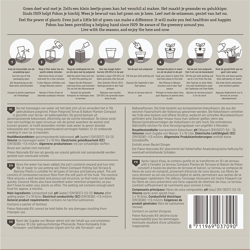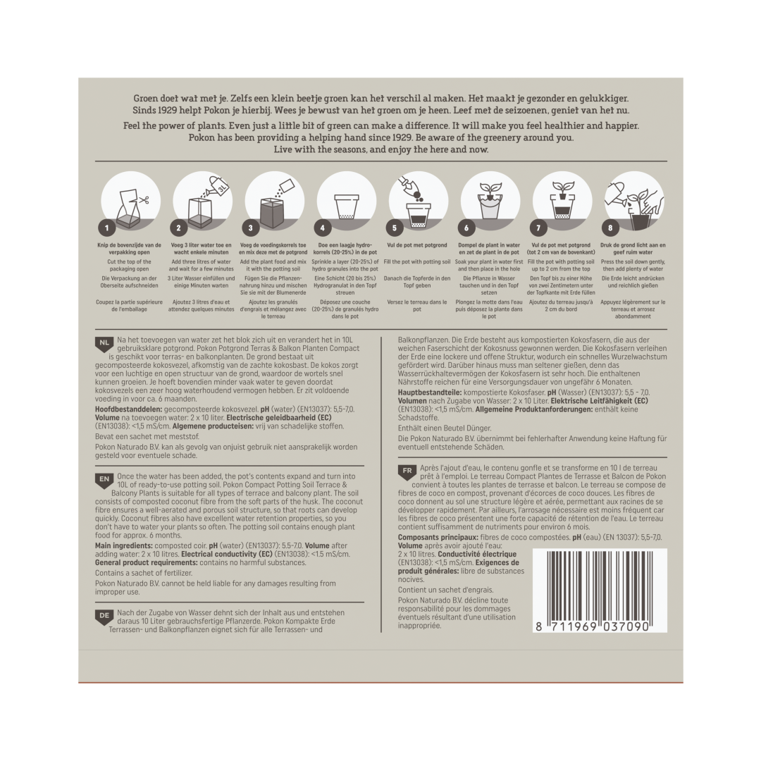 Pokon Terras & Balkon Planten Kokos Potgrond Compact is een samengeperste potgrond en is wateroplosbaar. Het bestaat uit gecomposteerde kokosvezel, afkomstig van de zachte kokosbast. Een pure en eerlijke basis voor kamerplanten doordat het natuurlijk is. De verpakking bevat daarnaast ook een zakje met voeding voor maar liefst 6 maanden. Wat neerkomt op een heel groeiseizoen.