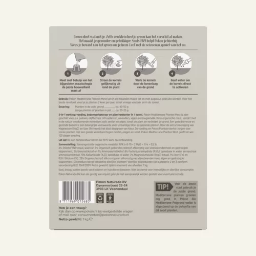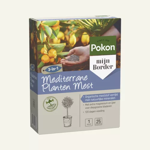 Pokon Mediterrane Planten Mest is een organische mest verrijkt met in de natuur voorkomende mineralen (zeoliet en algen). Het voedt de plant en verbetert de grond. Je mediterrane planten zullen sterker zijn met Pokon Mediterrane Planten Mest. Deze organische mest bevat essentiële voedingselementen en een rijke mix van sporenelementen waardoor jouw mediterrane planten mooi en gezond blijven.