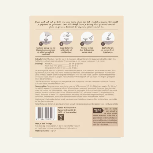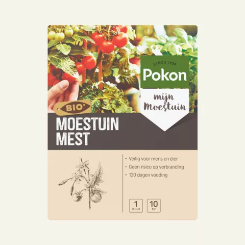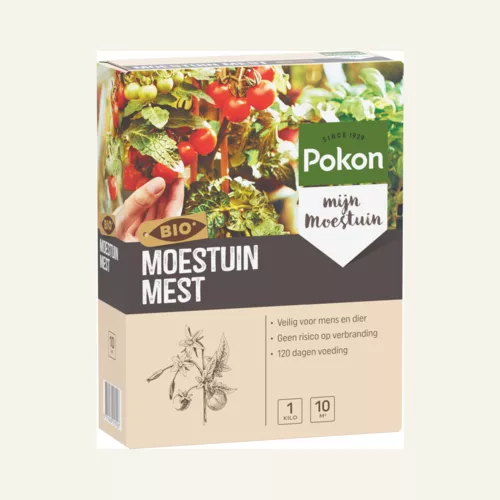 Pokon Bio Moestuin Mest is een samengestelde organische meststof met een NPK van 5-5-10 + 2MgO en zeewier. Deze meststof is toegestaan voor gebruik in de biologische land- en tuinbouw conform de EU-norm 834/2007.