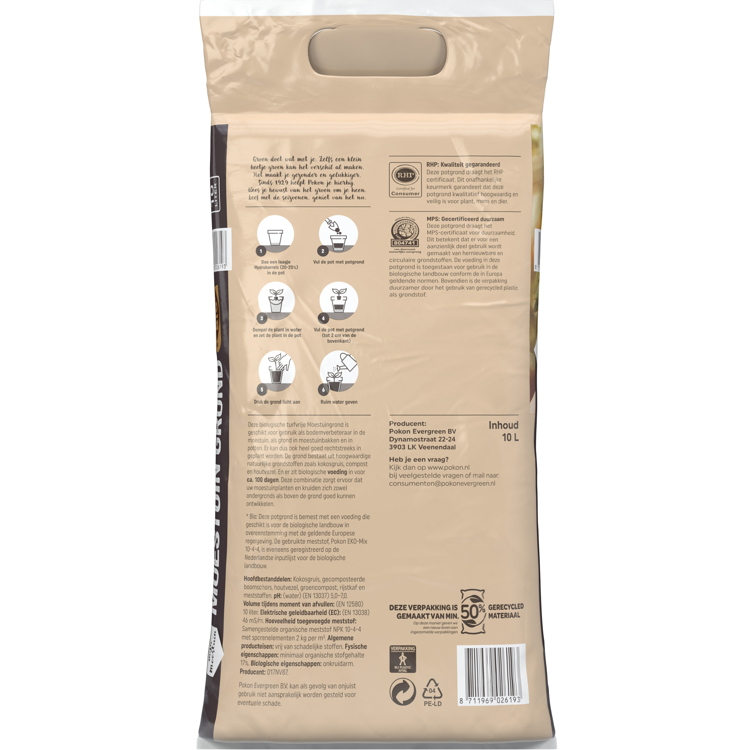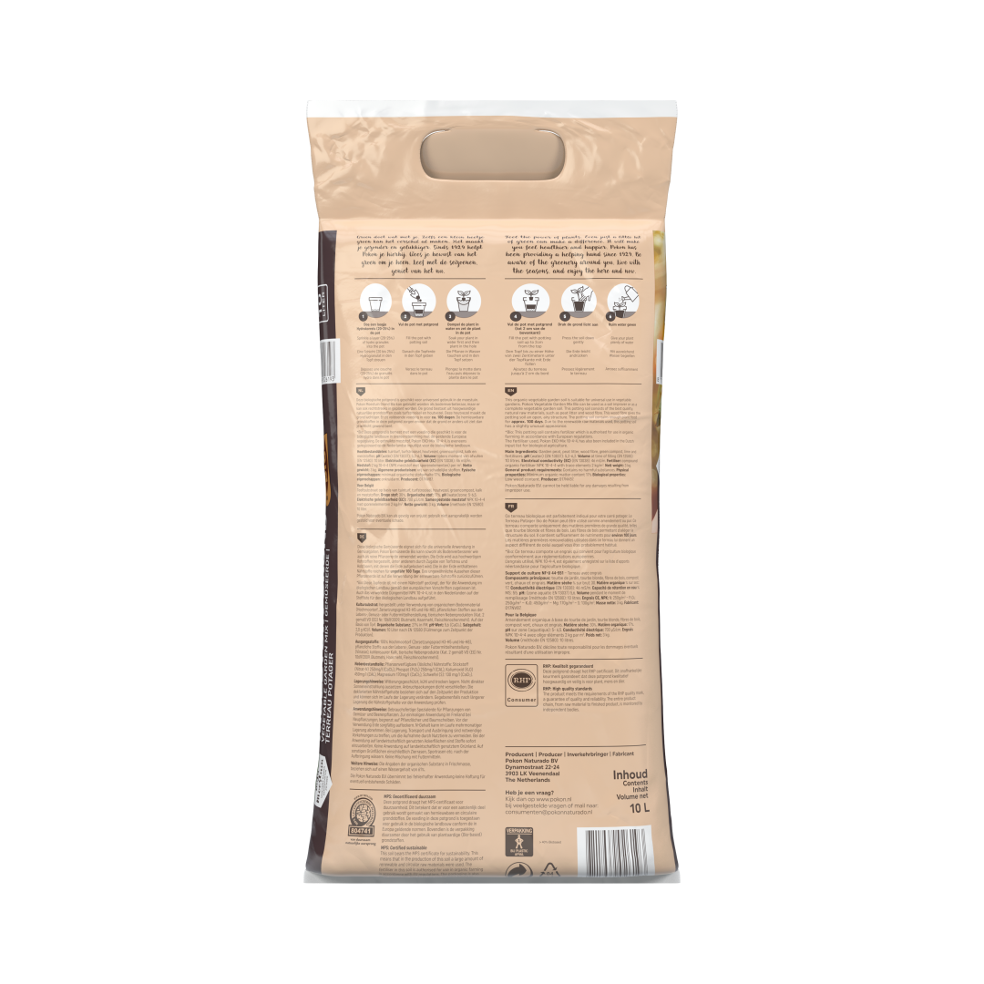 Pokon Bio Moestuin Grond is samengesteld uit natuurlijke en hoogwaardige grondstoffen, zoals kokosgruis, gecomposteerde boomschors, houtvezel, groencompost, rijstkaf en meststoffen. Aan deze grond is bovendien gecertificeerde gemalen houtvezel toegevoegd. Dit zorgt voor meer lucht in de bodem en heeft een positief effect op het bodemleven. De uitgebalanceerde samenstelling zorgt voor een luchtige en evenwichtige voedingsbodem in de moestuin en water en voedingsstoffen worden veel beter vastgehouden. Hierdoor kunnen planten zich optimaal ontwikkelen. Let op: door de toevoeging van gecertificeerde gemalen houtvezel kan schimmelvorming optreden in de verpakking. Dit kan absoluut geen kwaad voor plant, mens en dier. Het draagt zelfs in positieve zin bij aan het actieve bodemleven!