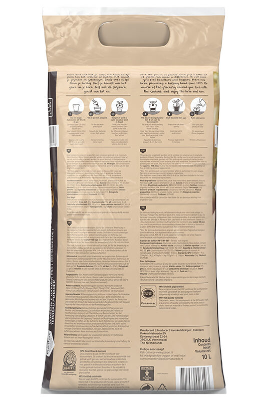 Deze potgrond is bemest met Pokon EKO-Mix 10-4-4, dit is toegestaan voor gebruik in de biologische landbouw conform de EU normen 834/2007 en 889/2008.