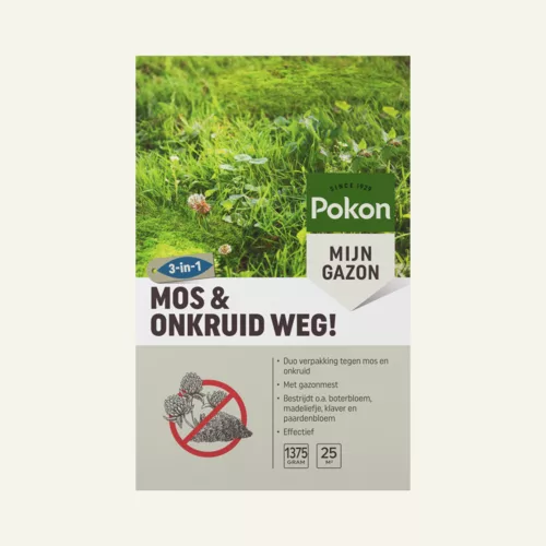 Pokon Mos en Onkruid Weg! is een pakket met zowel een gazonvoeding met onkruidbestrijder als een gazonvoeding met mosbestrijder. Door mos en onkruid verstikt het gras waardoor het gazon wordt verstoord. Pokon Mos Weg! geeft voeding aan het gazon en werkt snel en effectief tegen mossen in gazons. Onkruid Weg! geeft voeding aan het gazon en is werkzaam tegen boterbloem, madeliefje, witte klaver en paardenbloem.