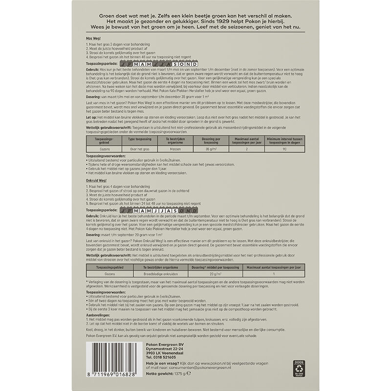 Pokon Mos en Onkruid Weg! is een pakket met zowel een gazonvoeding met onkruidbestrijder als een gazonvoeding met mosbestrijder. Door mos en onkruid verstikt het gras waardoor het gazon wordt verstoord. Pokon Mos Weg! geeft voeding aan het gazon en werkt snel en effectief tegen mossen in gazons. Onkruid Weg! geeft voeding aan het gazon en is werkzaam tegen boterbloem, madeliefje, witte klaver en paardenbloem.
