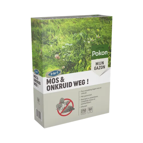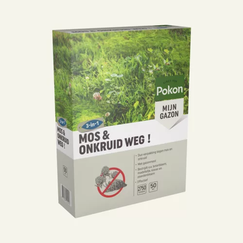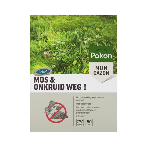 Pokon Mos en Onkruid Weg! is een pakket met zowel een gazonvoeding met onkruidbestrijder als een gazonvoeding met mosbestrijder. Door mos en onkruid verstikt het gras waardoor het gazon wordt verstoord. Pokon Mos Weg! geeft voeding aan het gazon en werkt snel en effectief tegen mossen in gazons. Onkruid Weg! geeft voeding aan het gazon en is werkzaam tegen boterbloem, madeliefje, witte klaver en paardenbloem.