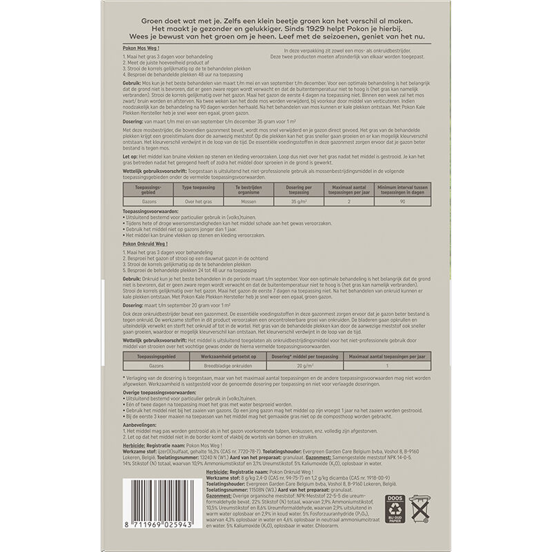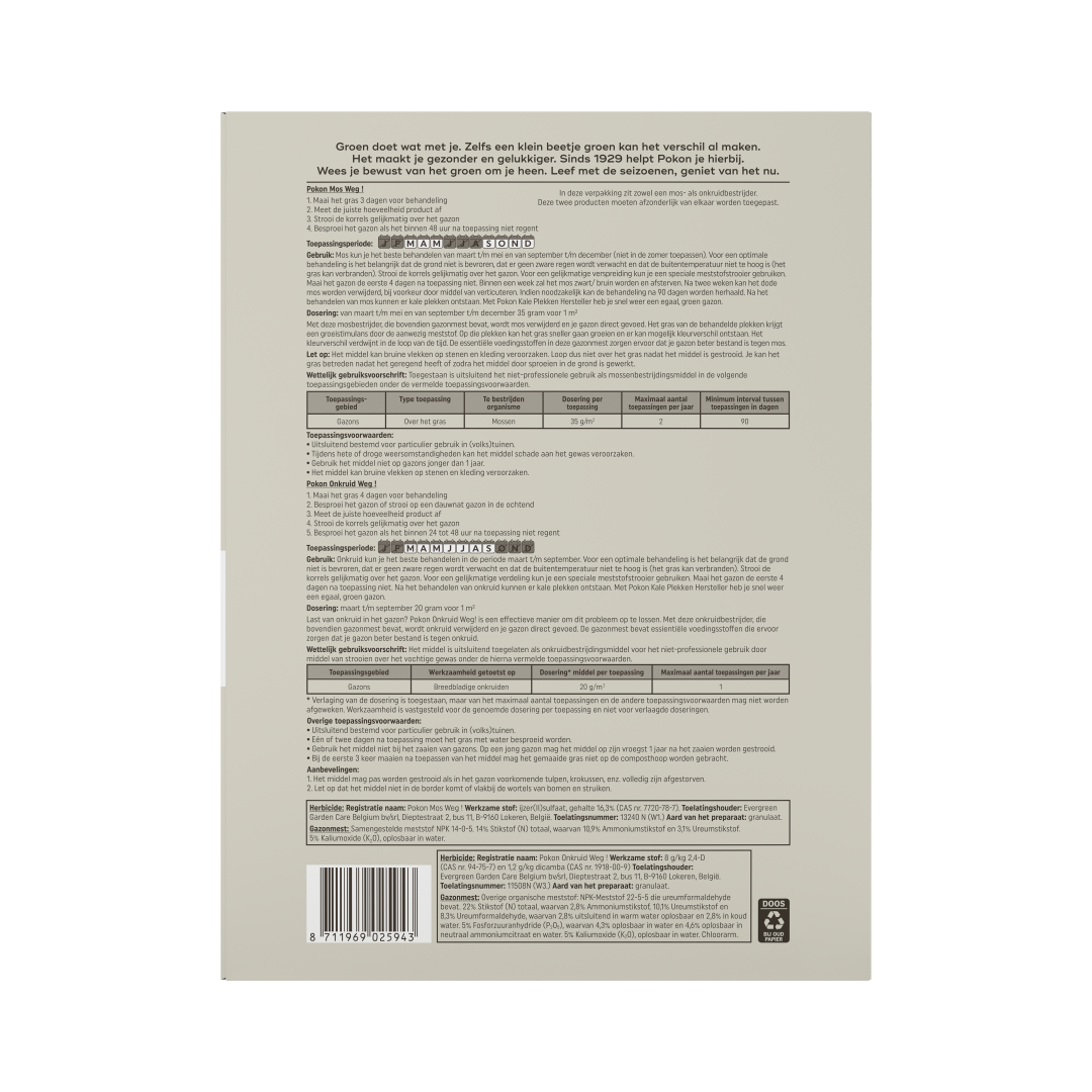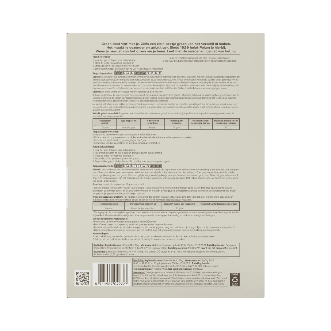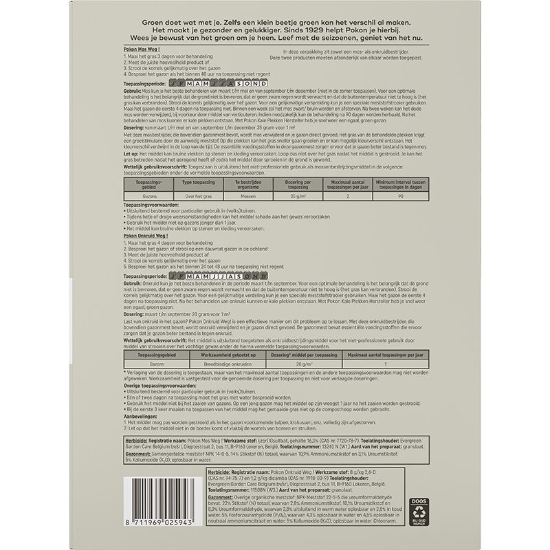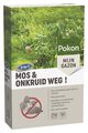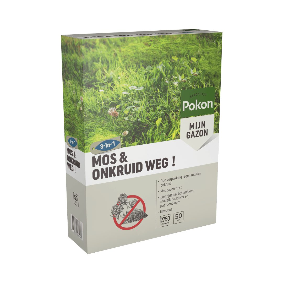 Pokon Mos en Onkruid Weg! is een pakket met zowel een gazonvoeding met onkruidbestrijder als een gazonvoeding met mosbestrijder. Door mos en onkruid verstikt het gras waardoor het gazon wordt verstoord. Pokon Mos Weg! geeft voeding aan het gazon en werkt snel en effectief tegen mossen in gazons. Onkruid Weg! geeft voeding aan het gazon en is werkzaam tegen boterbloem, madeliefje, witte klaver en paardenbloem.