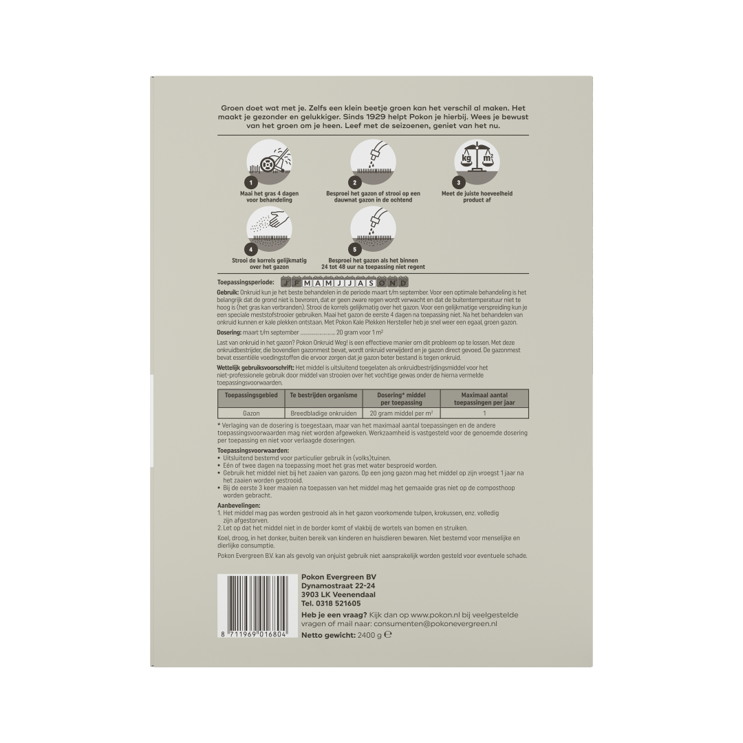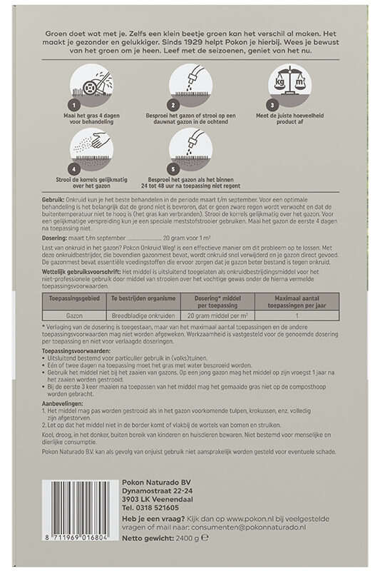 Pokon Onkruid Weg! is een gazonmest met een NPK van 22-5-5 i.c.m. met een onkruidbestrijder. Werkzame stof: 8 g/kg 2,4-D en 1,2 g/kg dicamba. Gebruik gewasbeschermingsmiddelen veilig. Lees voor gebruik eerst het etiket en de productinformatie.