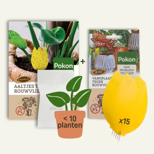 De levenscyclus van rouwvliegjes zijn kort. Hierdoor kunnen de insecten al snel uitgroeien tot een plaag. Voor een effectieve aanpak van rouwvliegjes zet je naast aaltjes ook vangplaatjes in. Pokon Bio Vangplaatjes Tegen Potgrondvliegjes bevatten 15 vangplaatjes die je in de potgrond steekt. Er zitten 5 metalen stekers in. Door de gele kleur worden rouwvliegjes aangetrokken en vang je de volwassen vliegjes. Hiermee wordt voorkomen dat zij eitjes in de potgrond leggen. Zo wordt de cyclus doorbroken waarna de potgrondvliegjes verdwijnen.