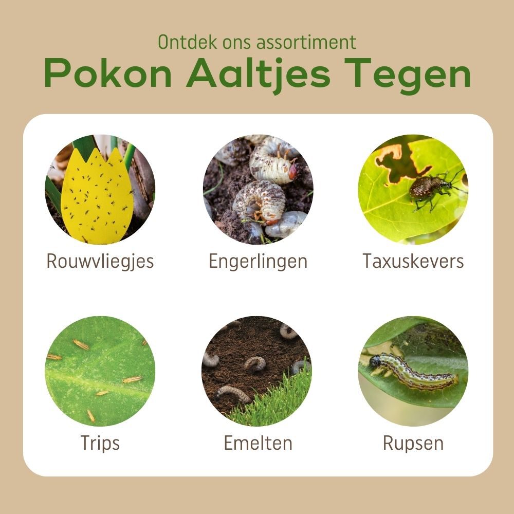 Pokon Aaltjes Tegen Rouwvliegjes bestaat voor 86% uit de aaltjes Steinernema feltiae – 14% inert biologisch afbreekbaar dragermateriaal. Microplastic vrije formule.