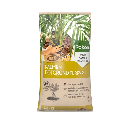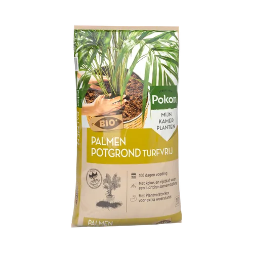 Geef je kamerpalmen de beste start met Pokon Bio Palmen Potgrond Turfvrij! Pokon Bio Palmen Potgrond Turfvrij is geschikt voor alle soorten kamerpalmen. Palmen staan binnen niet in hun natuurlijke omgeving en hebben daarom een goede voedingsbodem nodig. Deze potgrond bestaat uit hoogwaardige grondstoffen als kokosgruis, gecomposteerde boomschors, houtvezel, groencompost en rijstkaf. Er zit daarnaast voldoende voeding in voor ca. 100 dagen.