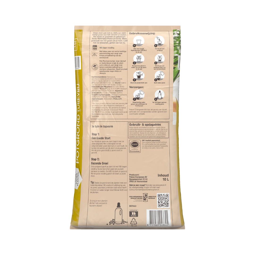- Biologische meststof: De grond is bemest met Pokon Eko-Mix 10-4-4, geschikt voor biologische landbouw volgens Europese regelgeving.