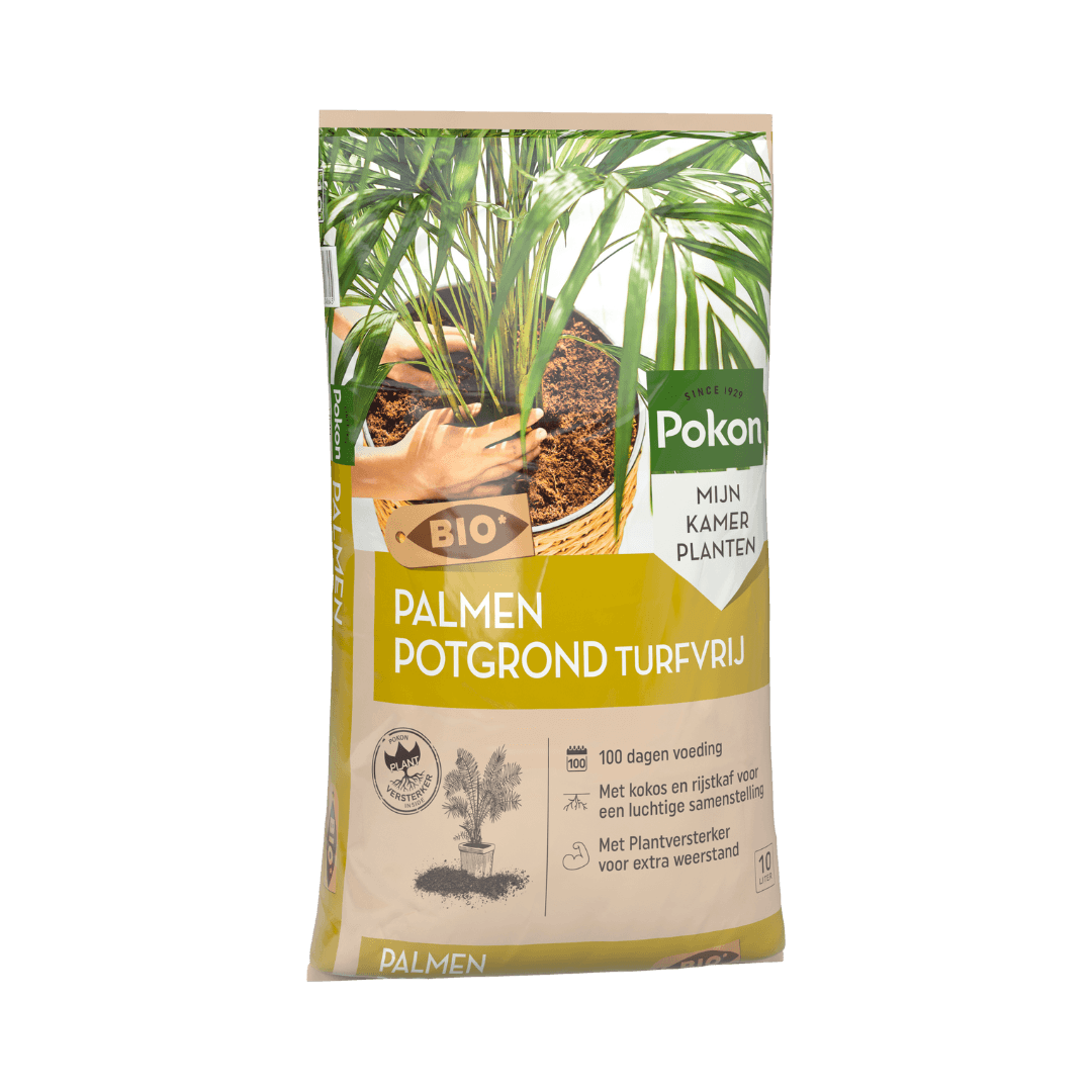 Geef je kamerpalmen de beste start met Pokon Bio Palmen Potgrond Turfvrij! Pokon Bio Palmen Potgrond Turfvrij is geschikt voor alle soorten kamerpalmen. Palmen staan binnen niet in hun natuurlijke omgeving en hebben daarom een goede voedingsbodem nodig. Deze potgrond bestaat uit hoogwaardige grondstoffen als kokosgruis, gecomposteerde boomschors, houtvezel, groencompost en rijstkaf. Er zit daarnaast voldoende voeding in voor ca. 100 dagen.
