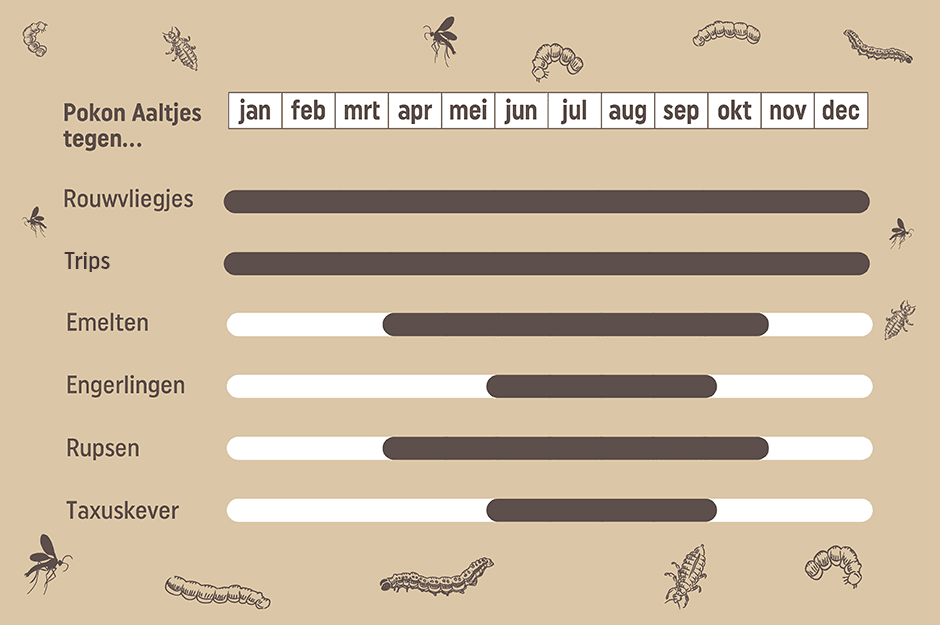Je kunt aaltjes tegen taxuskever het beste gebruiken in de maanden juni, juli, augustus en september. Dit is namelijk de periode waarin de taxuskeverlarve het meest actief zijn en ook de bodemtemperaturen in deze maanden zijn ideaal voor de aaltjes om te overleven en hun werk te doen.