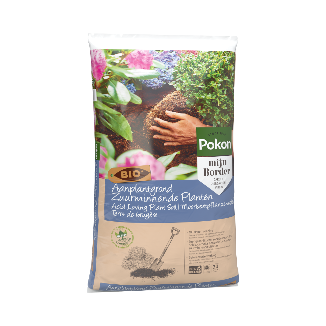 Deze Pokon Bio Aanplantgrond Zuurminnende planten is ideaal voor het aanplanten van zuurminnende planten, zoals de rododendron, ilex, hortensia, magnolia, azalea, heide, camelia en acer in je border. Er zit voldoende organische voeding in voor ca. 100 dagen. Alle niet-zuurminnende planten kun je gewoon in onze biologische aanplantgrond planten.