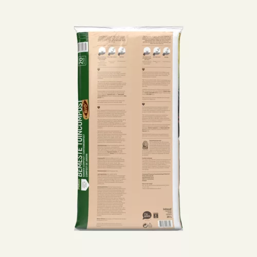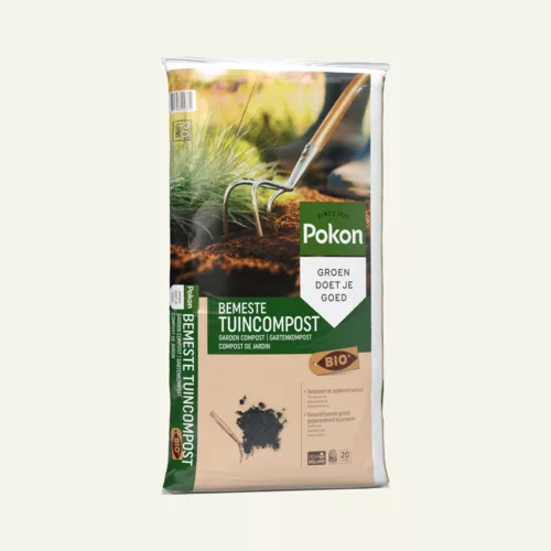 Organisch bodemverbeterend middel op basis van groencompost, gecomposteerde naaldhoutschors, kalk en meststoffen. Deze tuincompost is bemest met een voeding die geschikt is voor de biologische landbouw in overeenstemming met de geldende Europese regelgeving. De gebruikte meststof, Pokon EKO-Mix 10-4-4, is eveneens geregistreerd op de Nederlandse inputlijst voor biologische landbouw.
