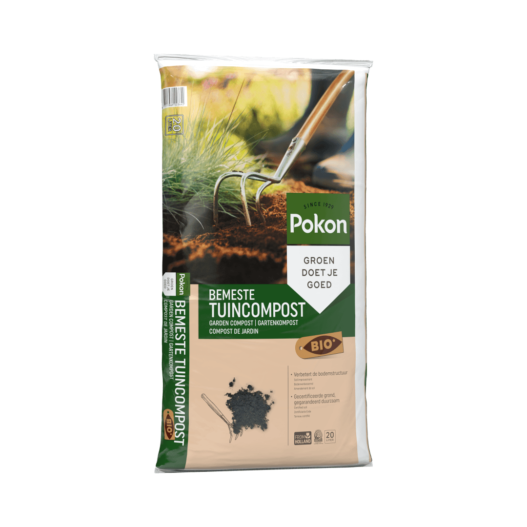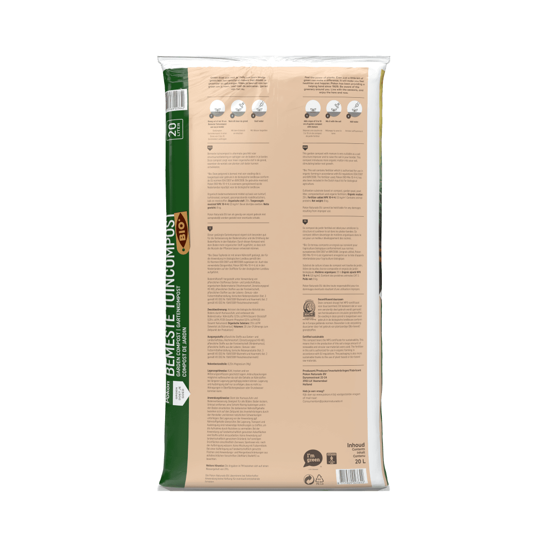 Organisch bodemverbeterend middel op basis van groencompost, gecomposteerde naaldhoutschors, kalk en meststoffen. Deze tuincompost is bemest met een voeding die geschikt is voor de biologische landbouw in overeenstemming met de geldende Europese regelgeving. De gebruikte meststof, Pokon EKO-Mix 10-4-4, is eveneens geregistreerd op de Nederlandse inputlijst voor biologische landbouw.
