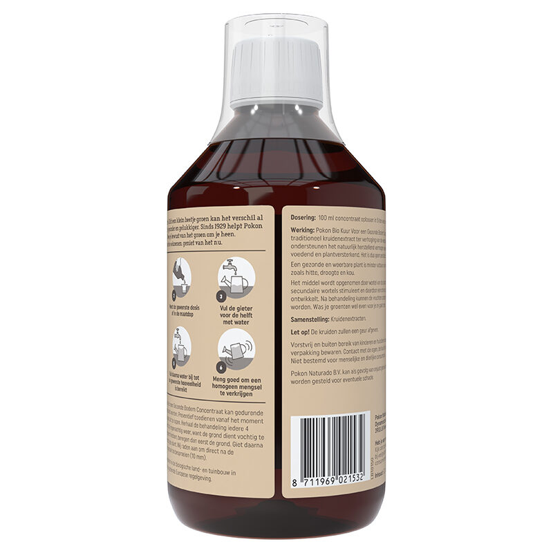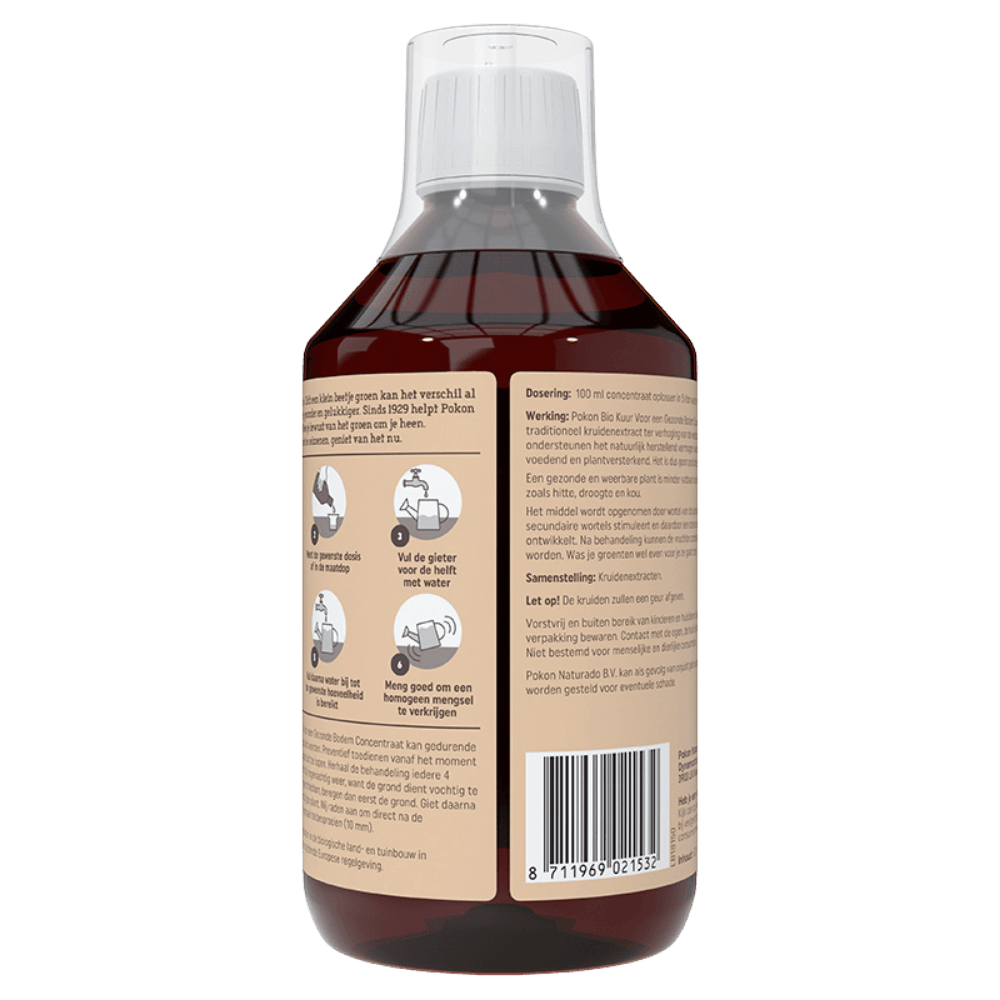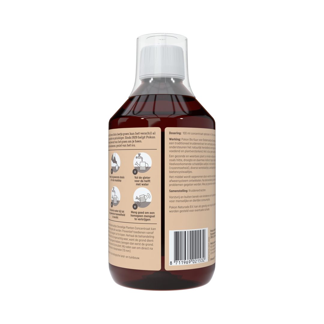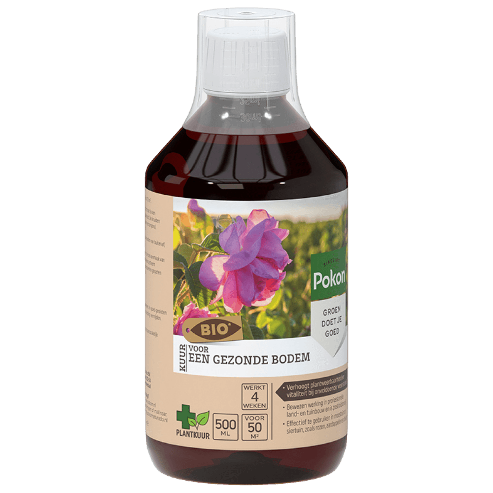 De kruidenextracten in Pokon Bio Kuur Voor een Gezonde Bodem Concentraat ondersteunen het natuurlijk herstellend vermogen, werken verzorgend, voedend en plantversterkend. Een gezonde en weerbare plant is minder vatbaar voor invloeden van buitenaf, zoals hitte, droogte en kou. Het concentraat is effectief te gebruiken in moestuin en siertuin, zoals rozen, aardappelen en bieten.