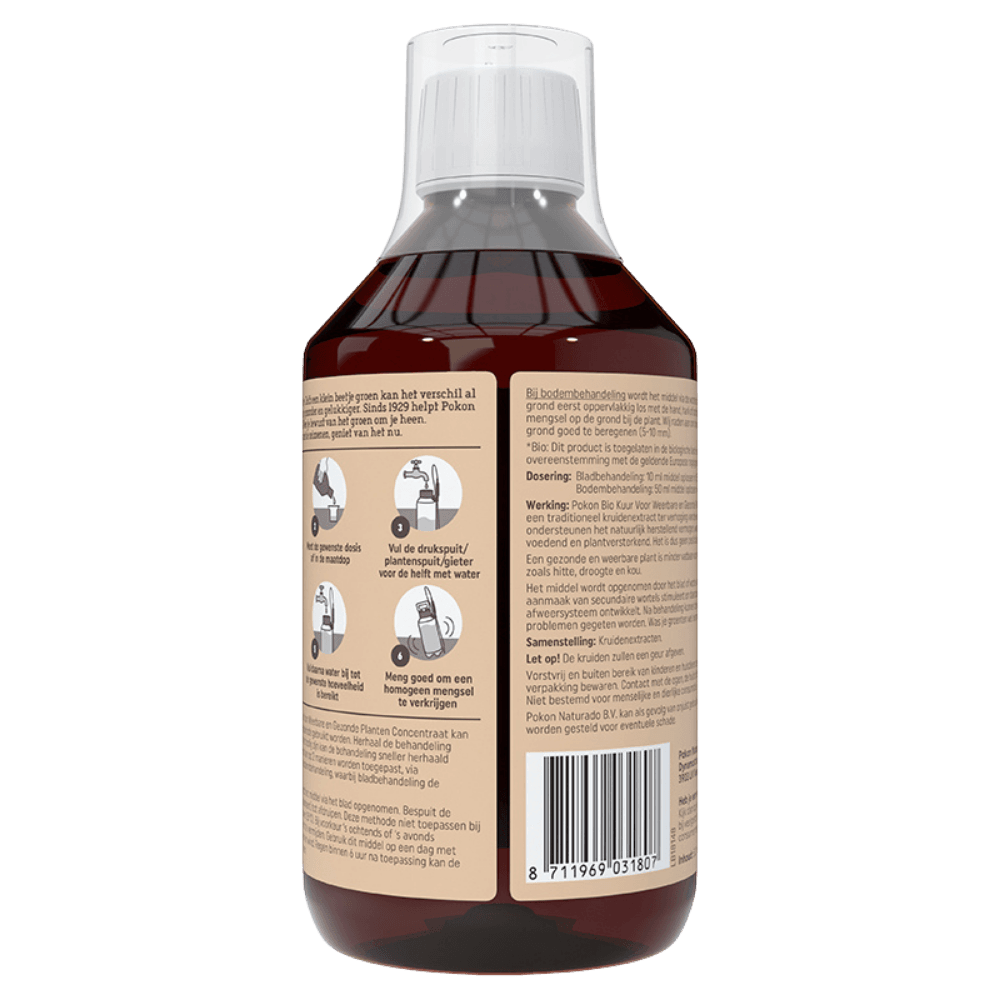 De kruidenextracten in deze plantkuur ondersteunen het natuurlijk herstellend vermogen, werken verzorgend, voedend en plantversterkend. Een gezonde en weerbare plant is minder vatbaar voor invloeden van buitenaf, zoals hitte, droogte en kou. Pokon Bio Kuur Voor Weerbare en Gezonde Planten Concentraat kan op 2 manieren toegepast worden: via het blad of via de bodem. Het middel stimuleert de aanmaak van nieuwe wortels waardoor de plant een sterker afweersysteem ontwikkelt. Het product heeft een bewezen werking in de professionele land- en tuinbouw en is pesticidenvrij.