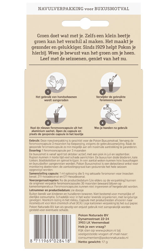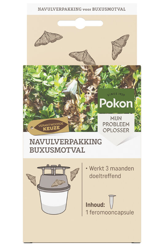 Buxusrupsen kunnen in korte tijd veel schade aanrichten. Je buxussen kunnen dode bladeren, kale takken, bladskeletten en spinsel krijgen. In een aantal weken kunnen hele buxushagen en buxusbollen aangevreten worden. De buxusmot is vanaf april tot oktober actief, met een piek in juli en september. Pokon Buxusmotval Navulling is een navulling voor de Pokon Buxusmotval. Dit is een detectieval enkel voor monitoring doeleinden: de aantastingsgraad kan gedurende het hele seizoen gevolgd worden. Plaats de Pokon Buxusmotval aan het begin van het seizoen (april), voordat de eerste buxusmotten waarneembaar zijn. De mannelijke motten worden aangetrokken door het feromoon, dringen de val binnen en worden gevangengenomen. Het doorzichtige reservoir laat eenvoudig de aanwezigheid van motten zien.
