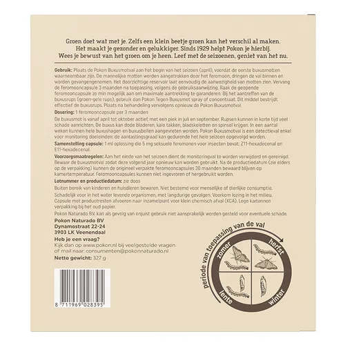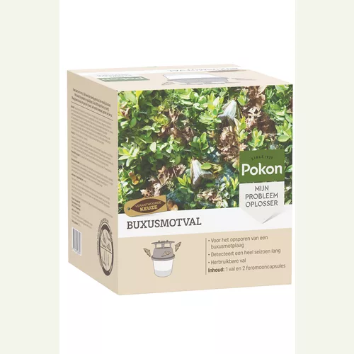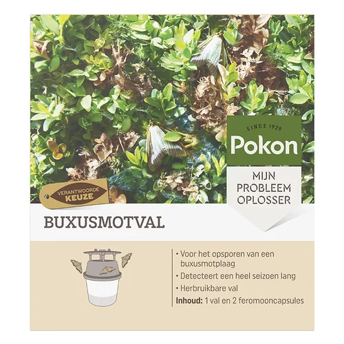 Buxusrupsen kunnen in korte tijd veel schade aanrichten. Je buxussen kunnen dode bladeren, kale takken, bladskeletten en spinsel krijgen. In een aantal weken kunnen hele buxushagen en buxusbollen aangevreten worden. De buxusmot is vanaf april tot oktober actief, met een piek in juli en september. Pokon Buxusmotval is een detectieval enkel voor monitoring doeleinden: de aantastingsgraad kan gedurende het hele seizoen gevolgd worden. Plaats de Pokon Buxusmotval aan het begin van het seizoen (april), voordat de eerste buxusmotten waarneembaar zijn. De mannelijke motten worden aangetrokken door het feromoon, dringen de val binnen en worden gevangengenomen. Het doorzichtige reservoir laat eenvoudig de aanwezigheid van motten zien.