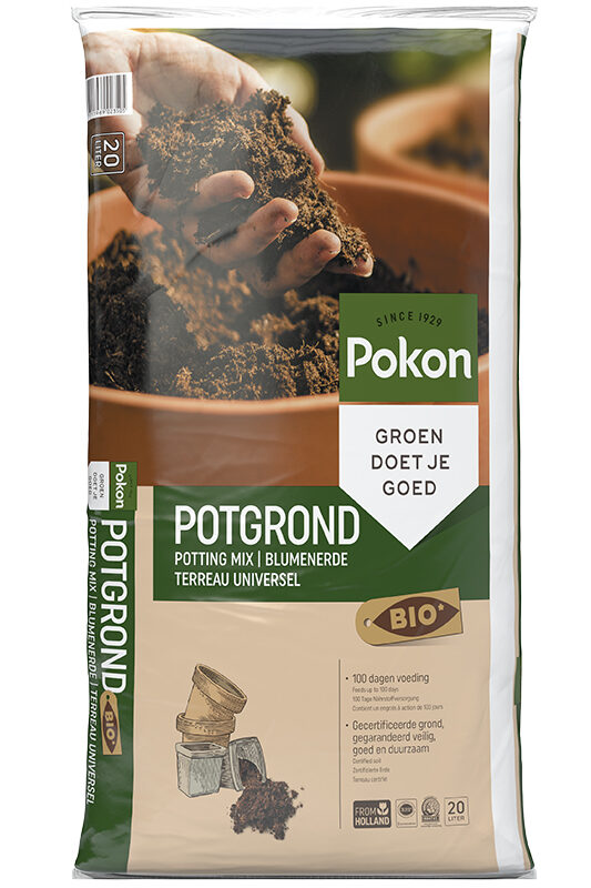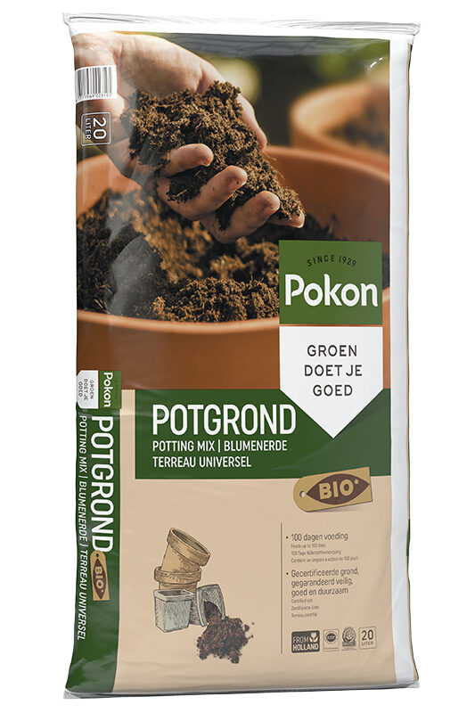 In de grond zitten voedingsstoffen die door de plant worden opgenomen. Na verloop van tijd raken deze voedingsstoffen op. Aan Pokon Bio Turfvrije Potgrond is voor 100 dagen voeding toegevoegd. Het is belangrijk om planten hierna regelmatig bij te voeden met een goede meststof of vloeibare plantenvoeding van Pokon.