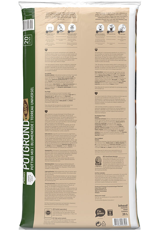 Pokon Bio Turfvrije Potgrond bevat uitsluitend hoogwaardige grondstoffen, zoals kokosgruis, gecomposteerde boomschors, houtvezel, groencompost, rijstkaf en meststoffen. In dit product zitten geen grondstoffen afkomstig van veen.