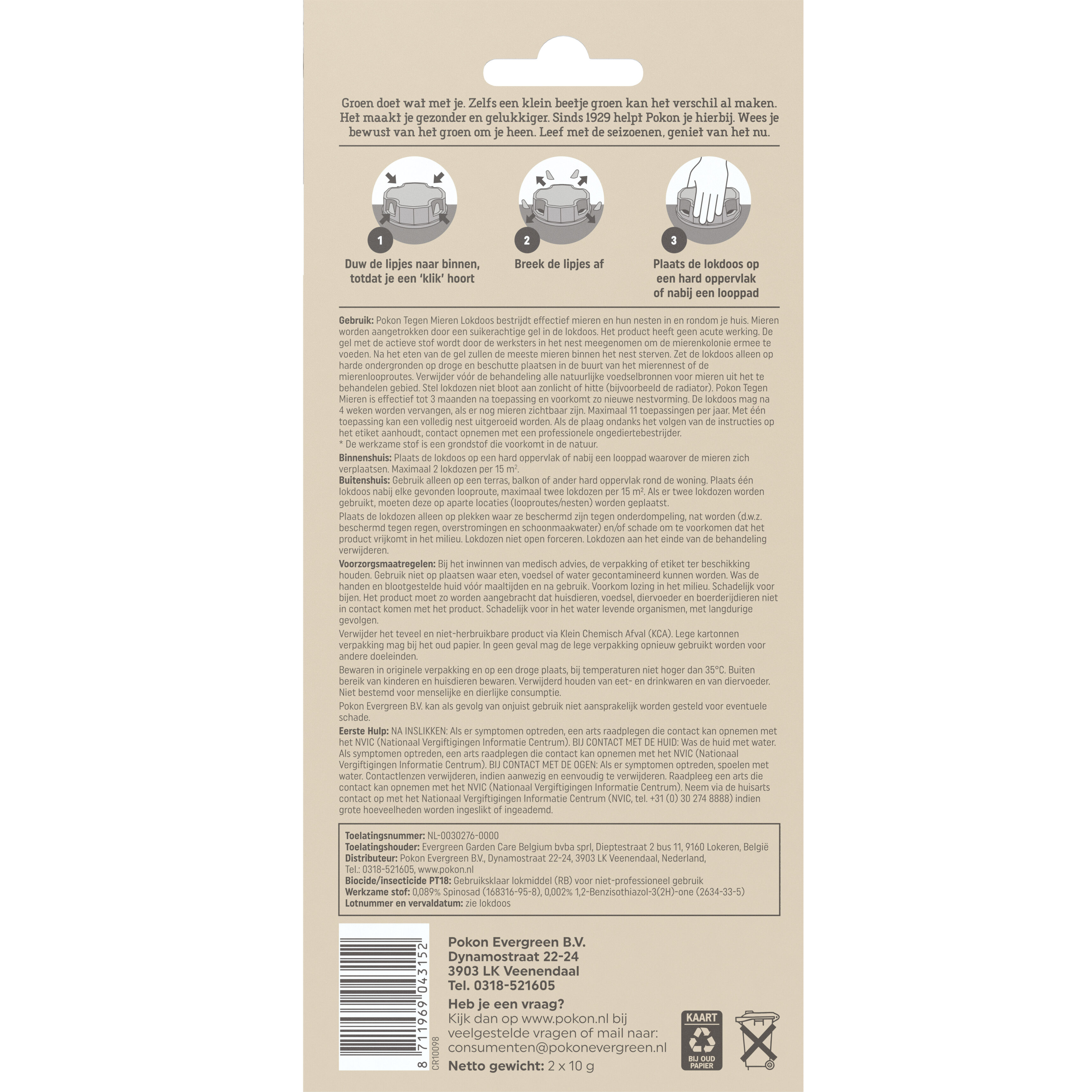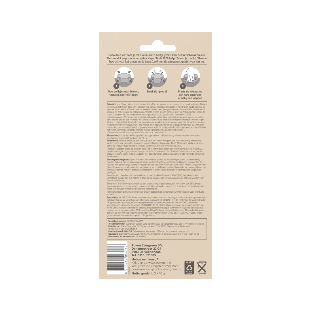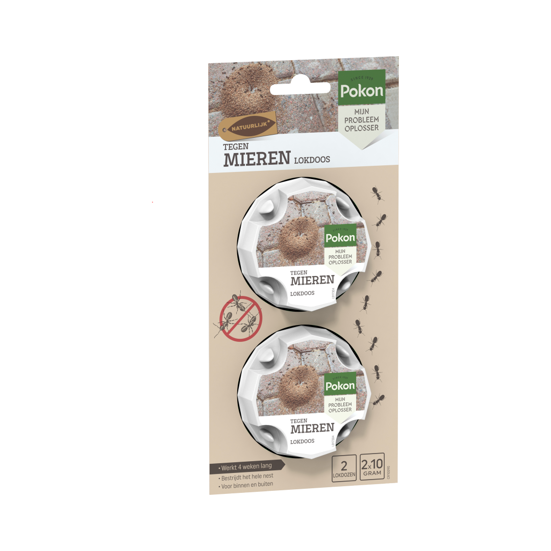 Pokon Tegen Mieren Lokdoos helpt je om mieren en hun nesten in en rondom je huis te bestrijden. De mieren worden aangetrokken door een suikerachtige gel in de lokdoos. Deze gel wordt door de werksters meegenomen naar het nest, waar de mierenkolonie ermee wordt gevoed. Na het eten van de gel sterven de meeste mieren in het nest.