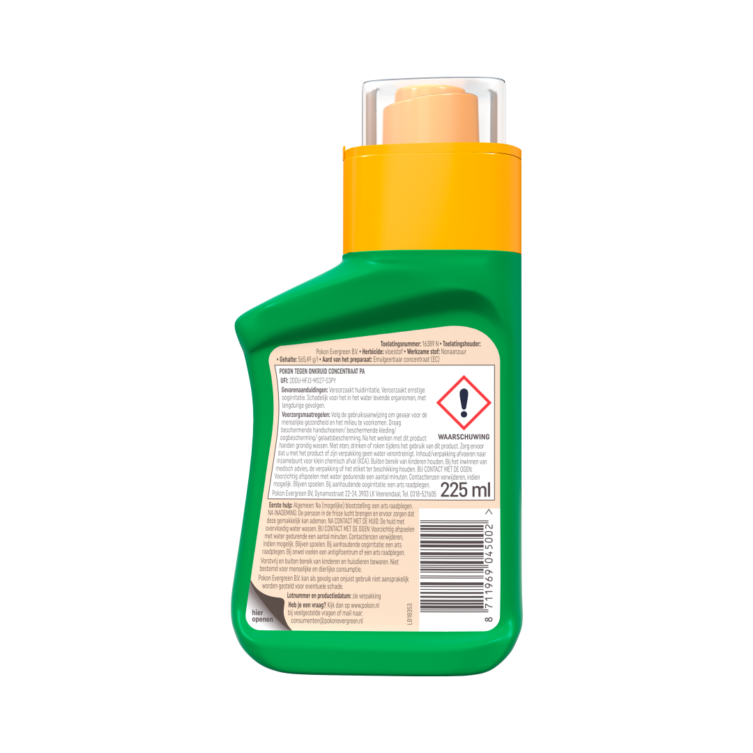 Pokon Tegen Onkruid Concentraat is de snelle en effectieve oplossing voor ongewenst onkruid. Binnen slechts 3 uur zijn de eerste resultaten zichtbaar, waarbij alle bovengrondse delen van het onkruid worden aangepakt. De werkzame stof (nonaanzuur) in dit product komt voor in de natuur en wordt snel afgebroken in de bodem.