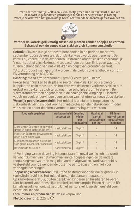 Pokon Bio Tegen Slakken Korrels is toegestaan voor gebruik in de biologische landbouw conform de Verordening (EU) 834/2007. De werkzame stof is 10 g/kg ijzer(III)fosfaat. Het toelatingsnummer is 15696 N. Gebruik gewasbeschermingsmiddelen veilig. Lees vóór gebruik eerst het etiket en de productinformatie.