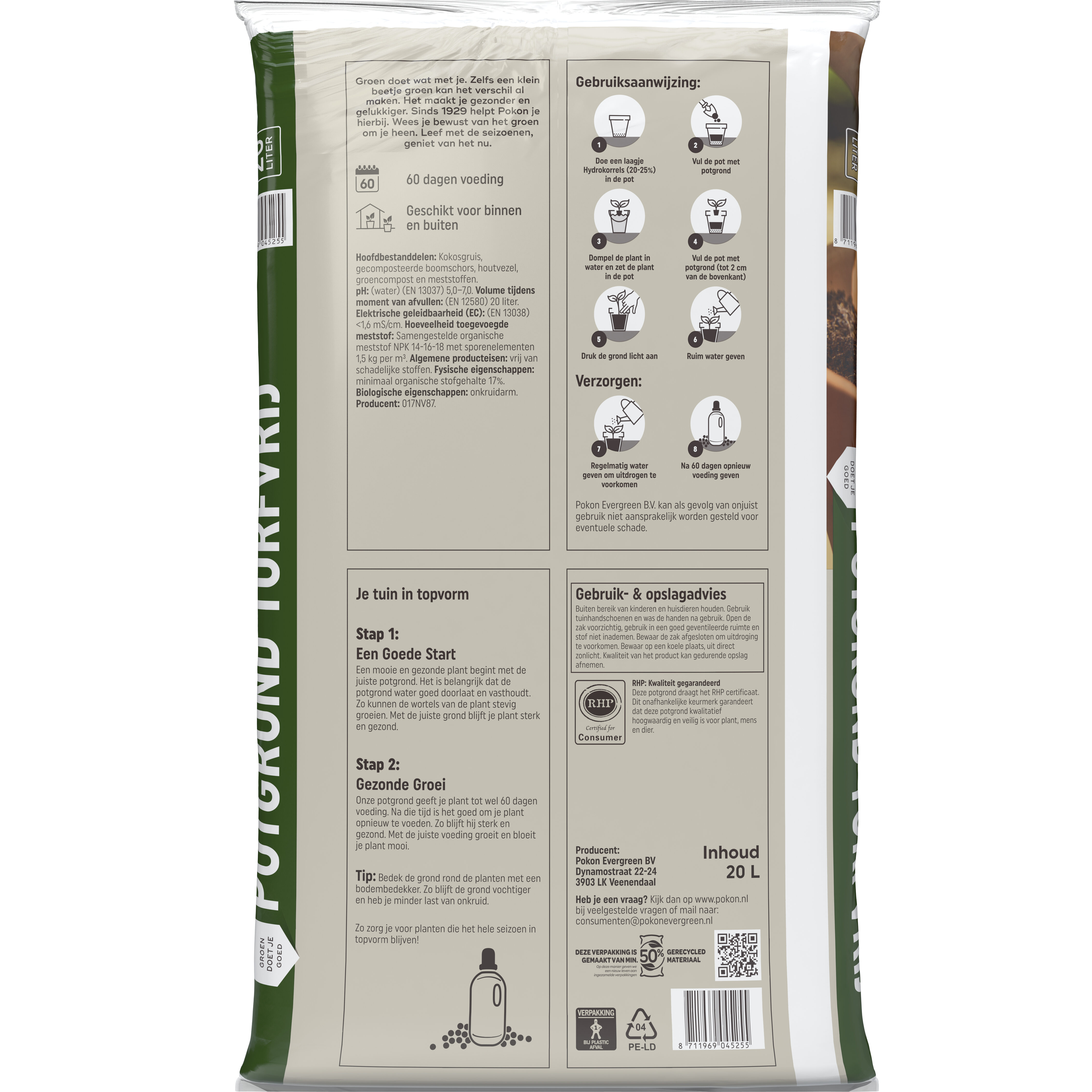 - De voedingstoffen in de potgrond worden door je plant opgenomen. Na verloop van tijd raken deze voedingstoffen die je plant nodig heeft op. Aan Pokon Turfvrije Potgrond Universeel is voor 2 maanden voeding toegevoegd. Het is belangrijk om je planten hierna regelmatig bij te voeden met een goede meststof of vloeibare plantenvoeding.