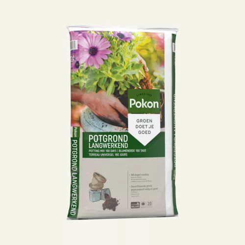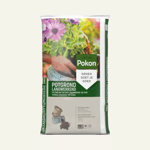 Pokon Potgrond Langwerkend is een goede voedingsbodem voor alle planten. De potgrond bevat uitsluitend hoogwaardige, natuurlijke grondstoffen, zoals turfstrooisel, tuinturf, kalk en meststoffen. Hierdoor wordt water goed vastgehouden en nemen planten de voeding goed op. Bovendien heeft Pokon een langwerkende meststof toegevoegd met voeding voor 6 maanden. Dit is een met kunsthars omhulde meststofkorrel die is toegevoegd en ervoor zorgt dat de meststof gedurende een heel groeiseizoen voeding aan de plant afgeeft. Is de korrel eenmaal leeg wordt het kunsthars laagje na verloop van tijd vanzelf afgebroken door bodemorganismen.