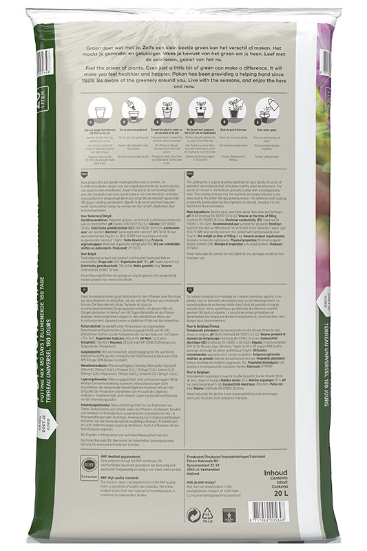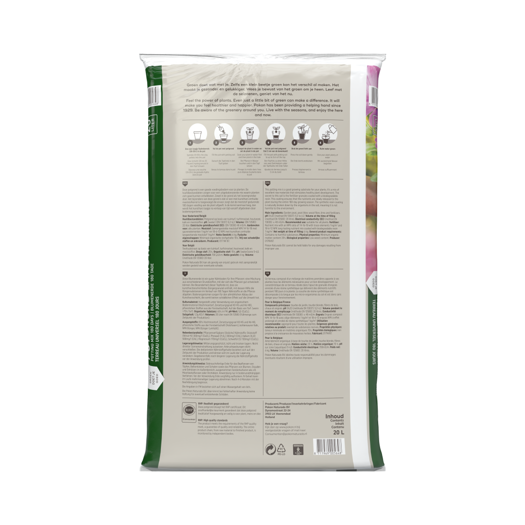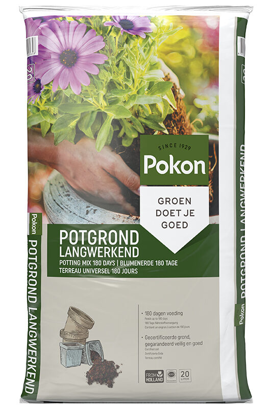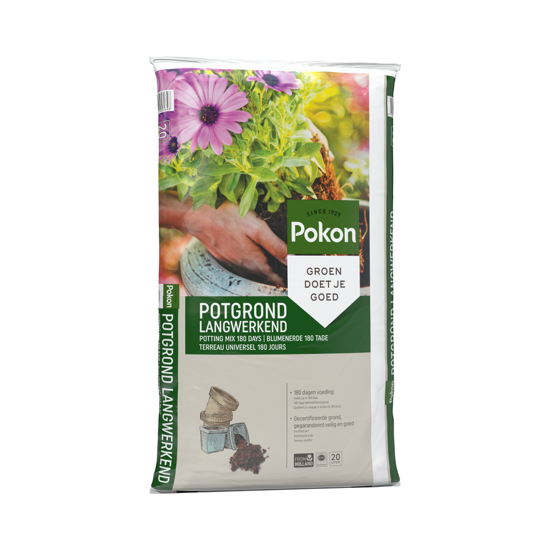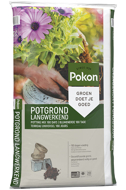 Pokon Potgrond Langwerkend is een goede voedingsbodem voor alle planten. De potgrond bevat uitsluitend hoogwaardige, natuurlijke grondstoffen, zoals turfstrooisel, tuinturf, kalk en meststoffen. Hierdoor wordt water goed vastgehouden en nemen planten de voeding goed op. Bovendien heeft Pokon een langwerkende meststof toegevoegd met voeding voor 6 maanden. Dit is een met kunsthars omhulde meststofkorrel die is toegevoegd en ervoor zorgt dat de meststof gedurende een heel groeiseizoen voeding aan de plant afgeeft. Is de korrel eenmaal leeg wordt het kunsthars laagje na verloop van tijd vanzelf afgebroken door bodemorganismen.