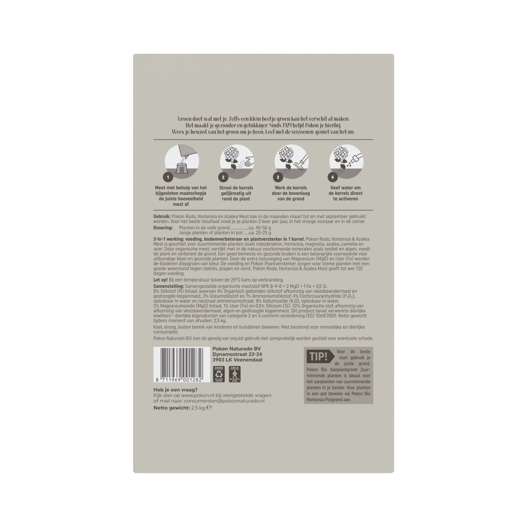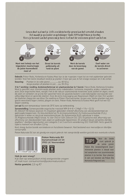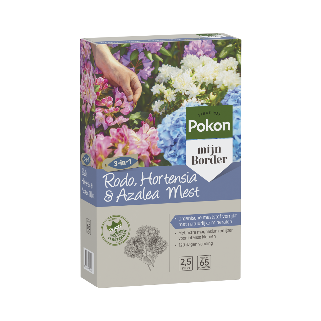 Pokon Rodo, Hortensia & Azalea Mest, verrijkt met in de natuur voorkomende mineralen (zeoliet en algen), voedt de plant en verbetert de grond. Deze organische voeding zorgt ervoor dat je hortensia's, rododendrons, azalea's en andere zuurminnende planten uitbundig bloeien en meer weerstand krijgen. Door de extra toevoeging van Magnesium (MgO) en IJzer (Fe) krijgen je bloemen een intensere kleur.