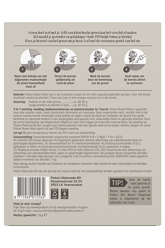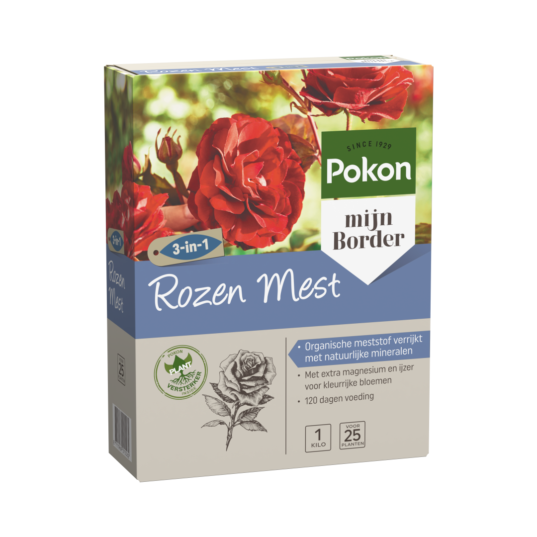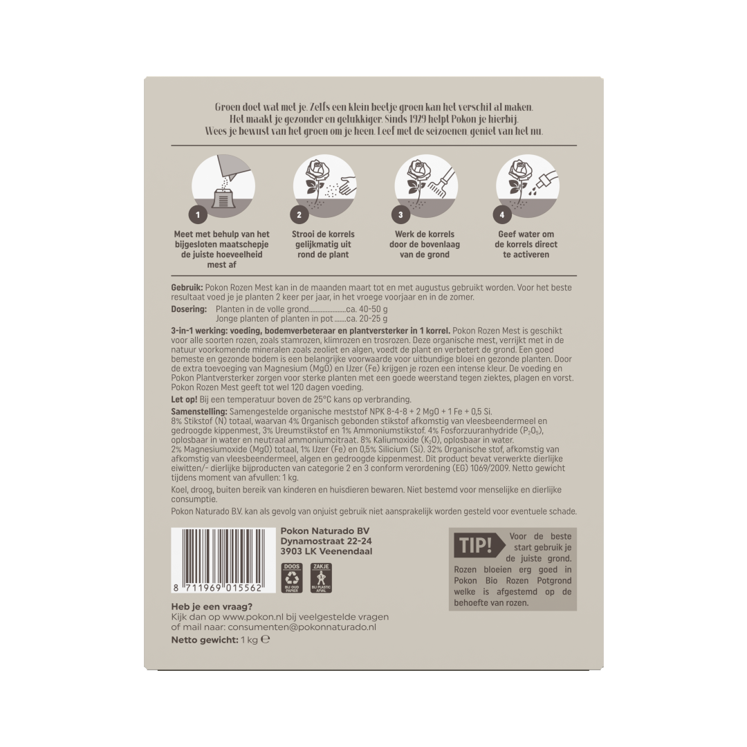 Rozen zijn veeleisende tuinplanten die specifieke voedingsstoffen nodig hebben om uitbundig te bloeien, gezond te blijven en weerstand te bieden tegen ziektes en plagen. Pokon Rozen Mest bevat een NPK-verhouding van 8-4-8, aangevuld met: magnesium (2% MgO): voor diepgroene bladeren, ijzer (1% Fe): voorkomt bladvergeling, silicium (0,5% Si): versterkt de plantstructuur en zeoliet en algen: natuurlijke bodemverbeteraars. Deze samenstelling is afgestemd op de groei- en bloeicyclus van rozen, die anders is dan bij bijvoorbeeld vaste planten of hagen.