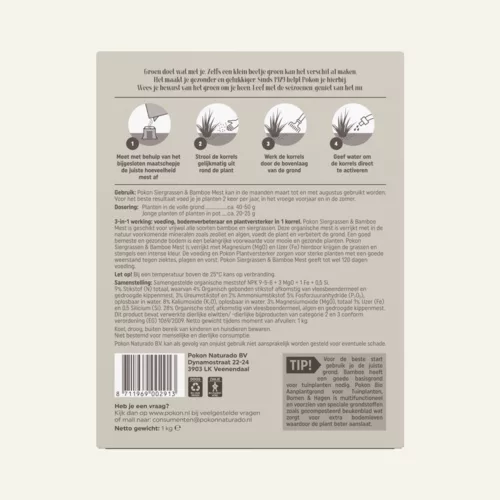 Pokon Siergrassen & Bamboe Mest is een samengestelde organische meststof met een NPK samenstelling 9-5-8 + 3 MgO + 1 Fe + 0,5 Si.