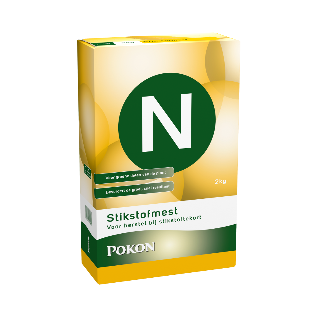 Pokon Stikstofmest bestaat voornamelijk uit Stikstof (N)23% voor groei en kleur met daaraan toegevoegd 3% magnesiumoxide (MgO) om de diep groene kleur te bevorderen.