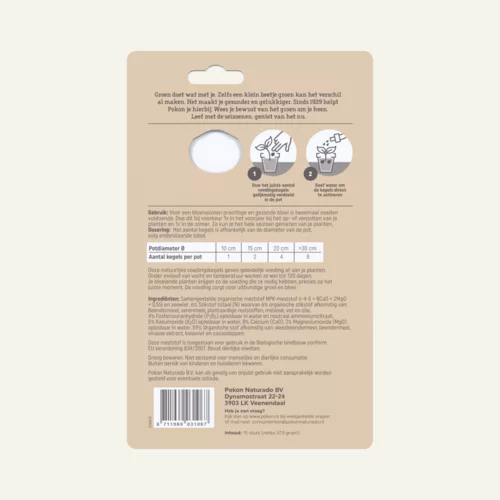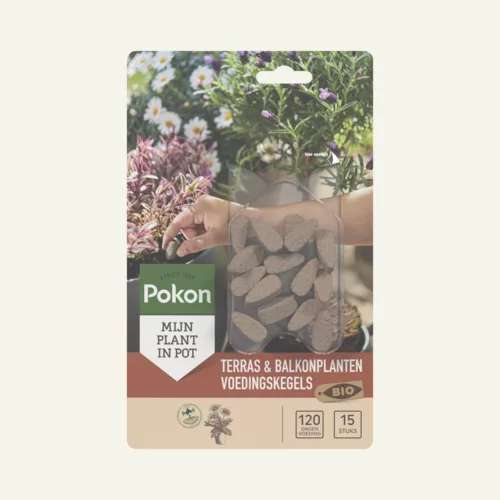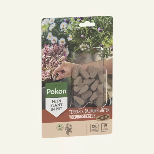 Pokon Bio Terras & Balkon Planten Voedingkegels geven wel 120 dagen voeding aan alle terras- en balkonplanten in pot. Deze slimme voedingskegels geven geleidelijk 120 dagen lang voeding af, onder invloed van temperatuur en de hoeveelheid vocht die beschikbaar is. Zo krijgen je planten de voeding die ze nodig hebben op het juiste moment.