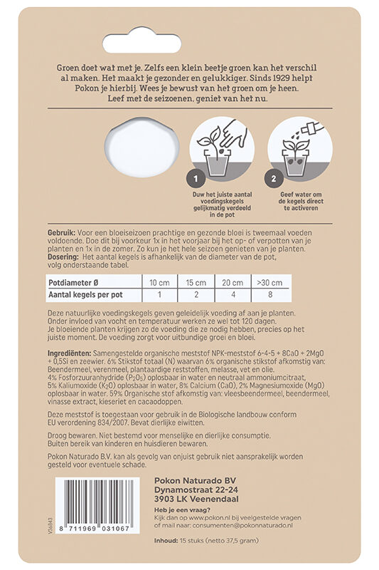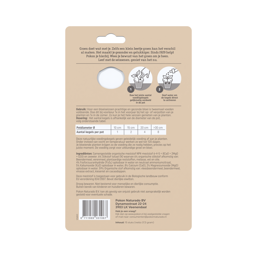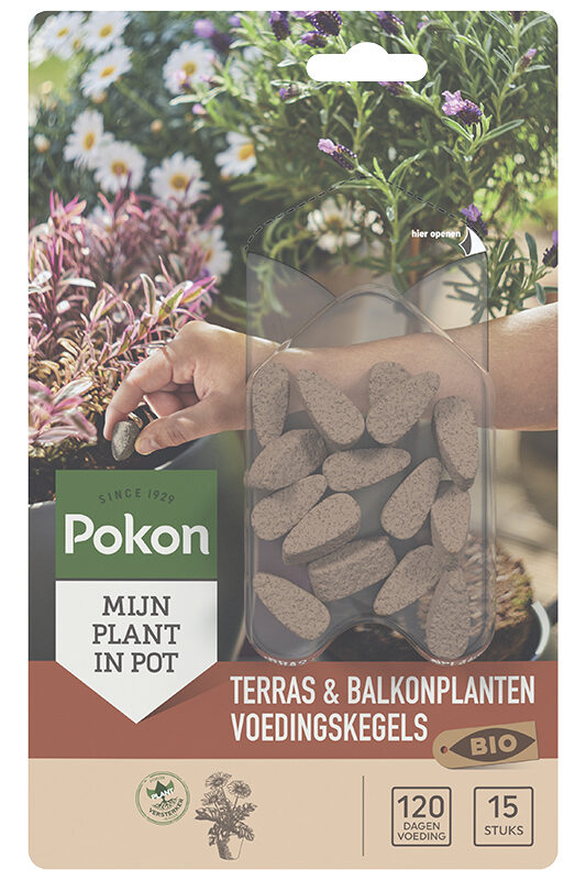 Pokon Bio Terras & Balkon Planten Voedingkegels geven wel 120 dagen voeding aan alle terras- en balkonplanten in pot. Deze slimme voedingskegels geven geleidelijk 120 dagen lang voeding af, onder invloed van temperatuur en de hoeveelheid vocht die beschikbaar is. Zo krijgen je planten de voeding die ze nodig hebben op het juiste moment.