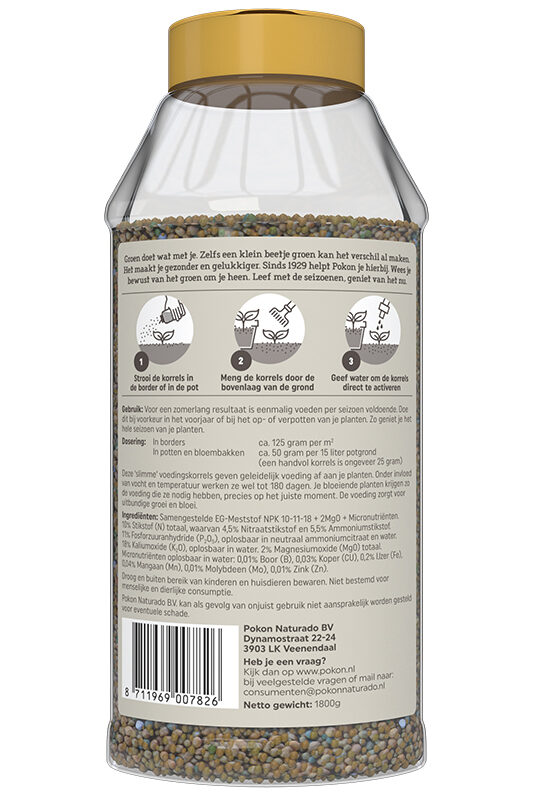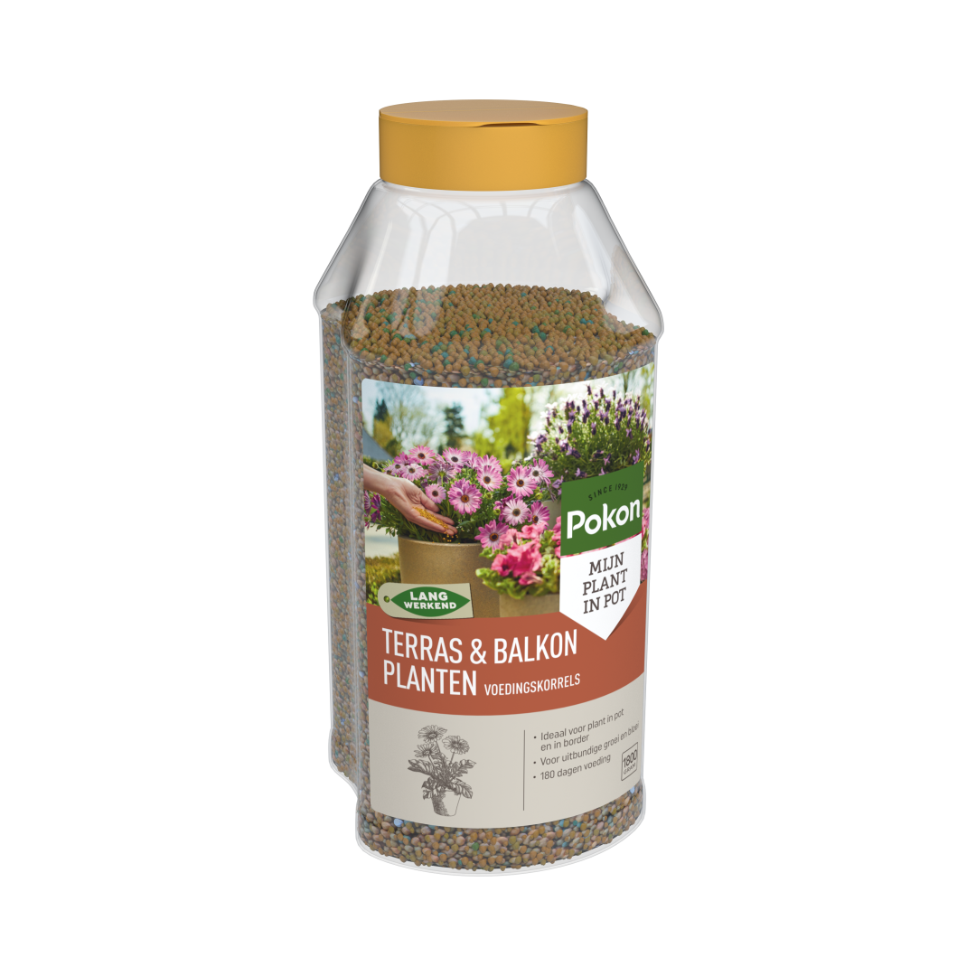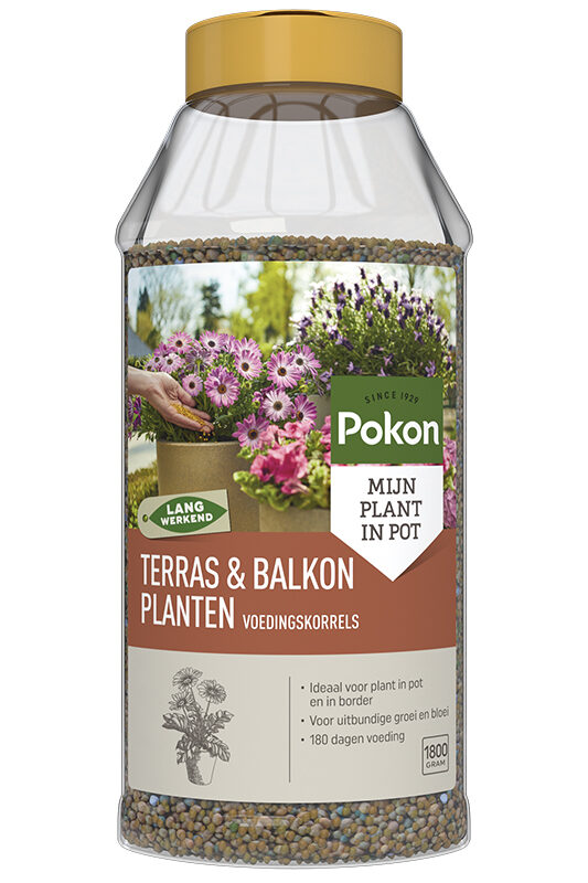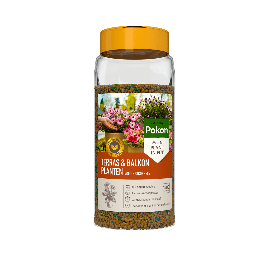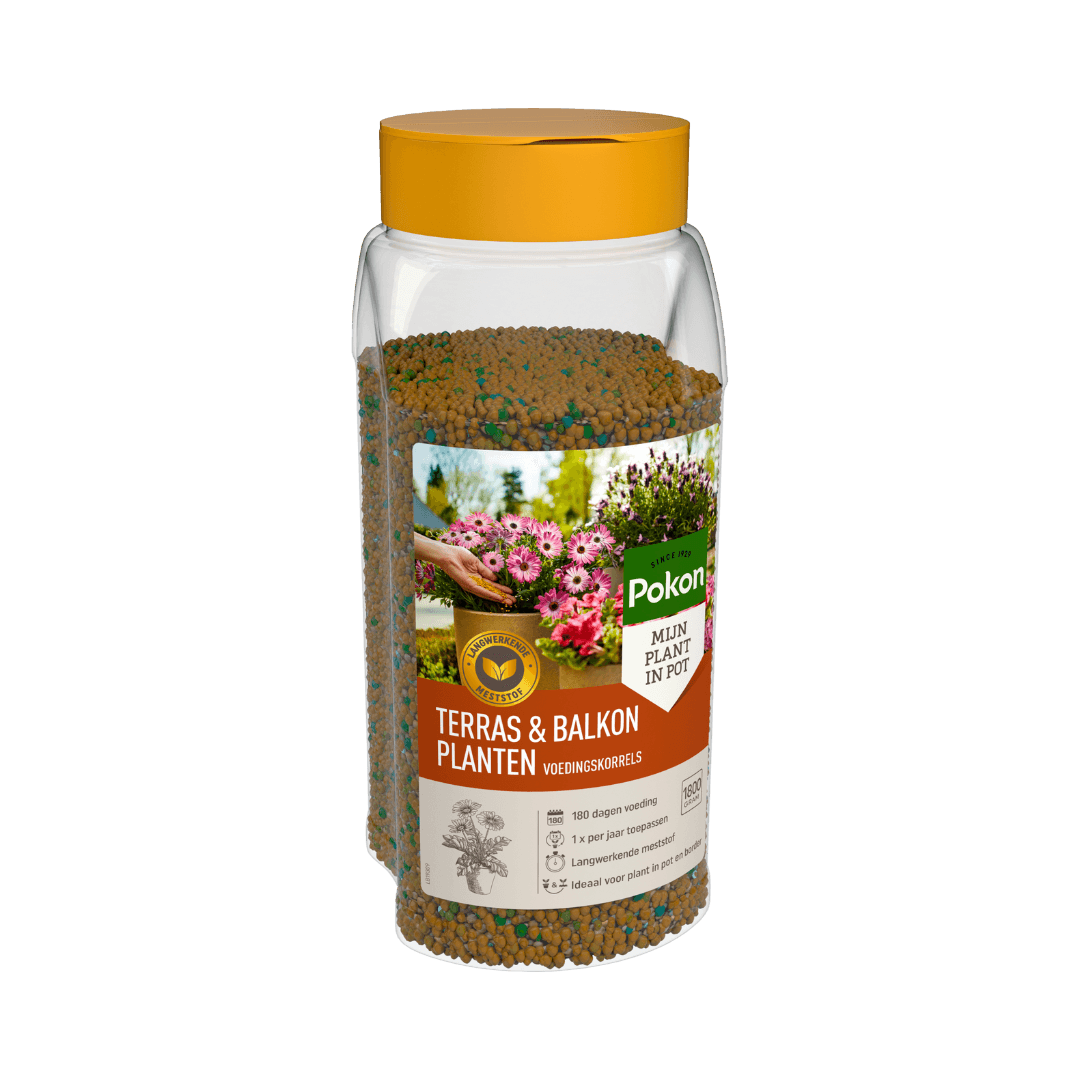 Pokon Terras & Balkon Planten Voedingskorrels zijn snelwerkende meststoffen met een samenstelling van NPK 11-11-18 + 2Mg0 + Micronutriënten.