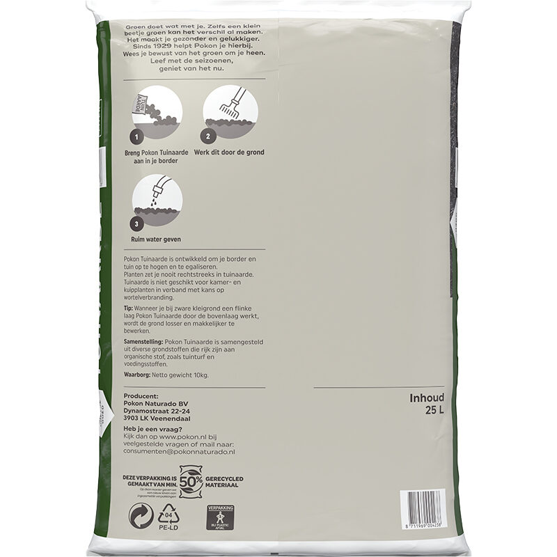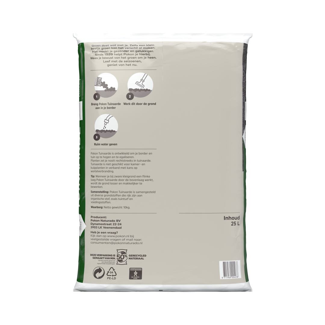 Pokon Tuinaarde is samengesteld uit diverse grondstoffen die rijk zijn aan organische stof, zoals GFT- en groencompost. Tuinaarde zorgt voor meer organische stof in de grond, waardoor de wortels van de planten zich goed kunnen ontwikkelen.