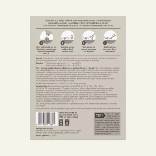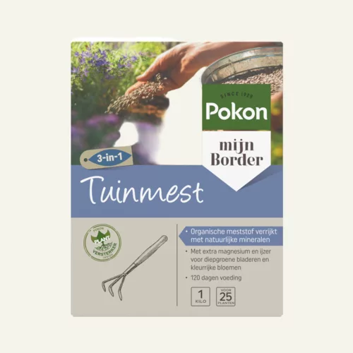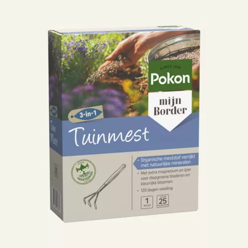 Pokon Tuinmest, verrijkt met in de natuur voorkomende mineralen (zeoliet en algen), voedt de plant en verbetert de grond. De organische voeding zorgt ervoor dat je tuinplanten goed groeien, bloeien en meer weerstand krijgen. Door de extra toevoeging van Magnesium (MgO) en IJzer (Fe) worden je planten mooier, extra groen en bloeien ze intenser.