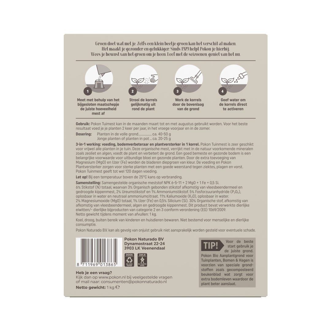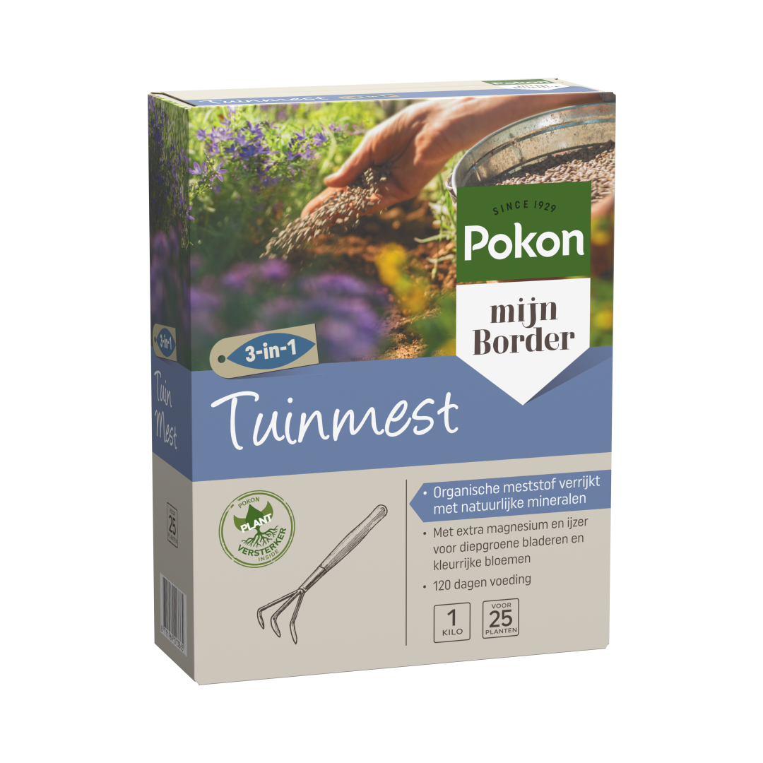 Pokon Tuinmest, verrijkt met in de natuur voorkomende mineralen (zeoliet en algen), voedt de plant en verbetert de grond. De organische voeding zorgt ervoor dat je tuinplanten goed groeien, bloeien en meer weerstand krijgen. Door de extra toevoeging van Magnesium (MgO) en IJzer (Fe) worden je planten mooier, extra groen en bloeien ze intenser.