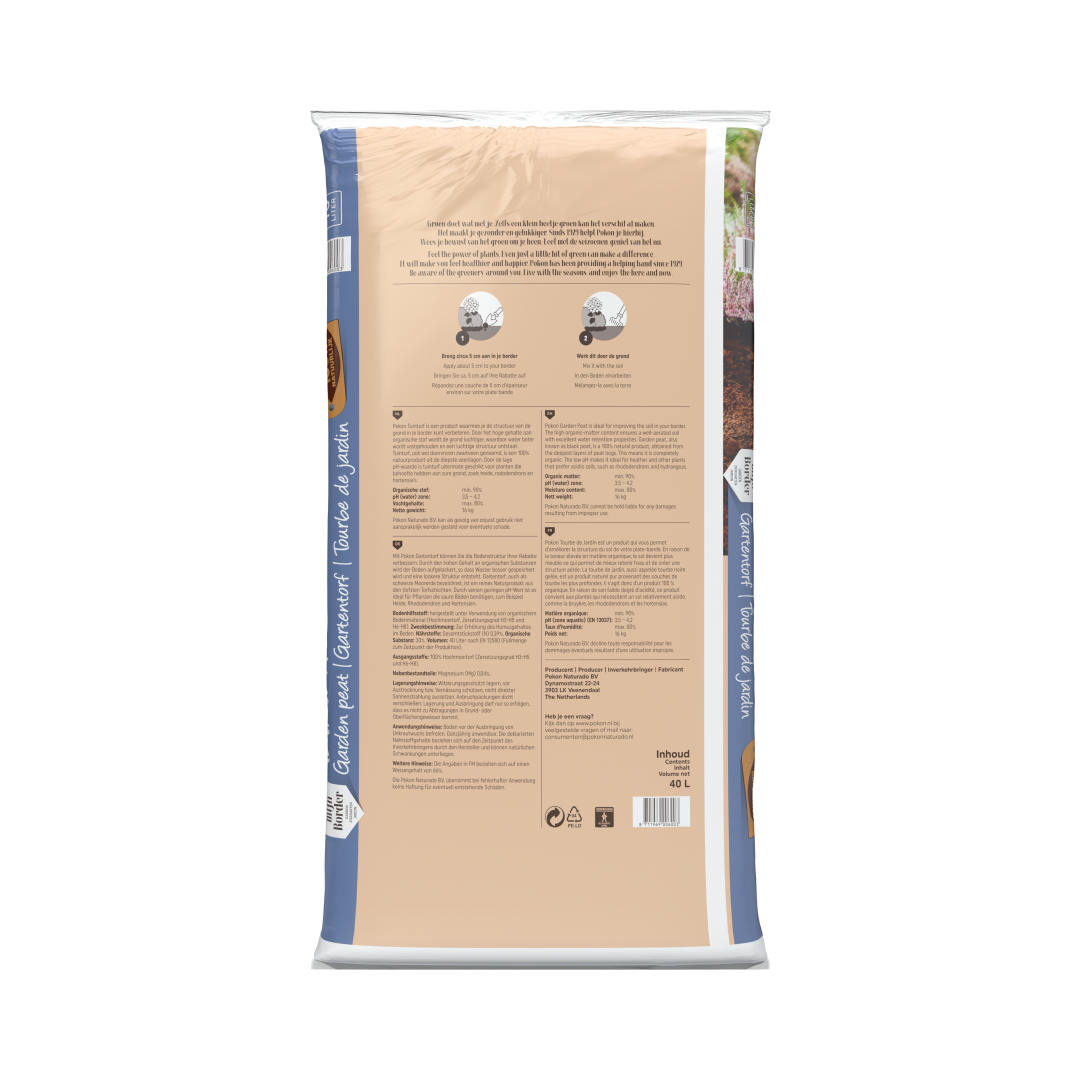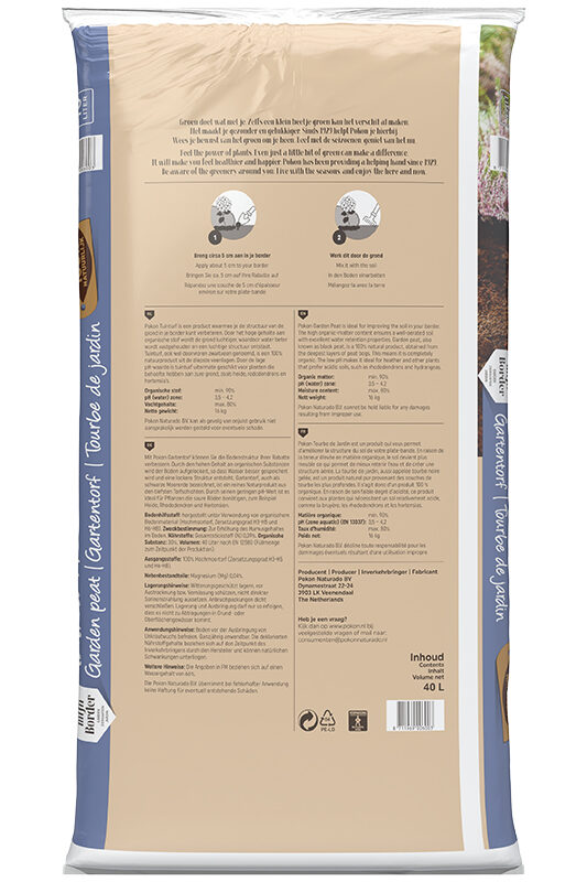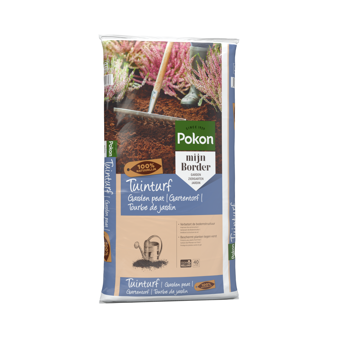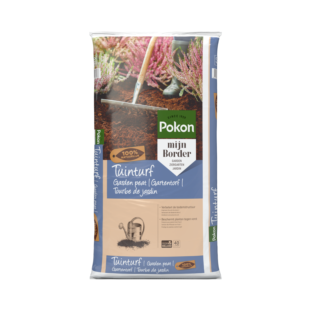 Pokon Tuinturf is een organisch bodem verbeterend middel dat uitermate geschikt is voor het verbeteren (verlagen) van de zuurgraad van de grond. Tuinturf is een maagdelijk natuurproduct uit de bovenste veenlagen. Het is organisch. De lichtbruine kleur geeft aan dat het veen slechts weinig verteerd is. Het heeft een lage PH (zuurgraad) en een hoog wateropnemend vermogen.