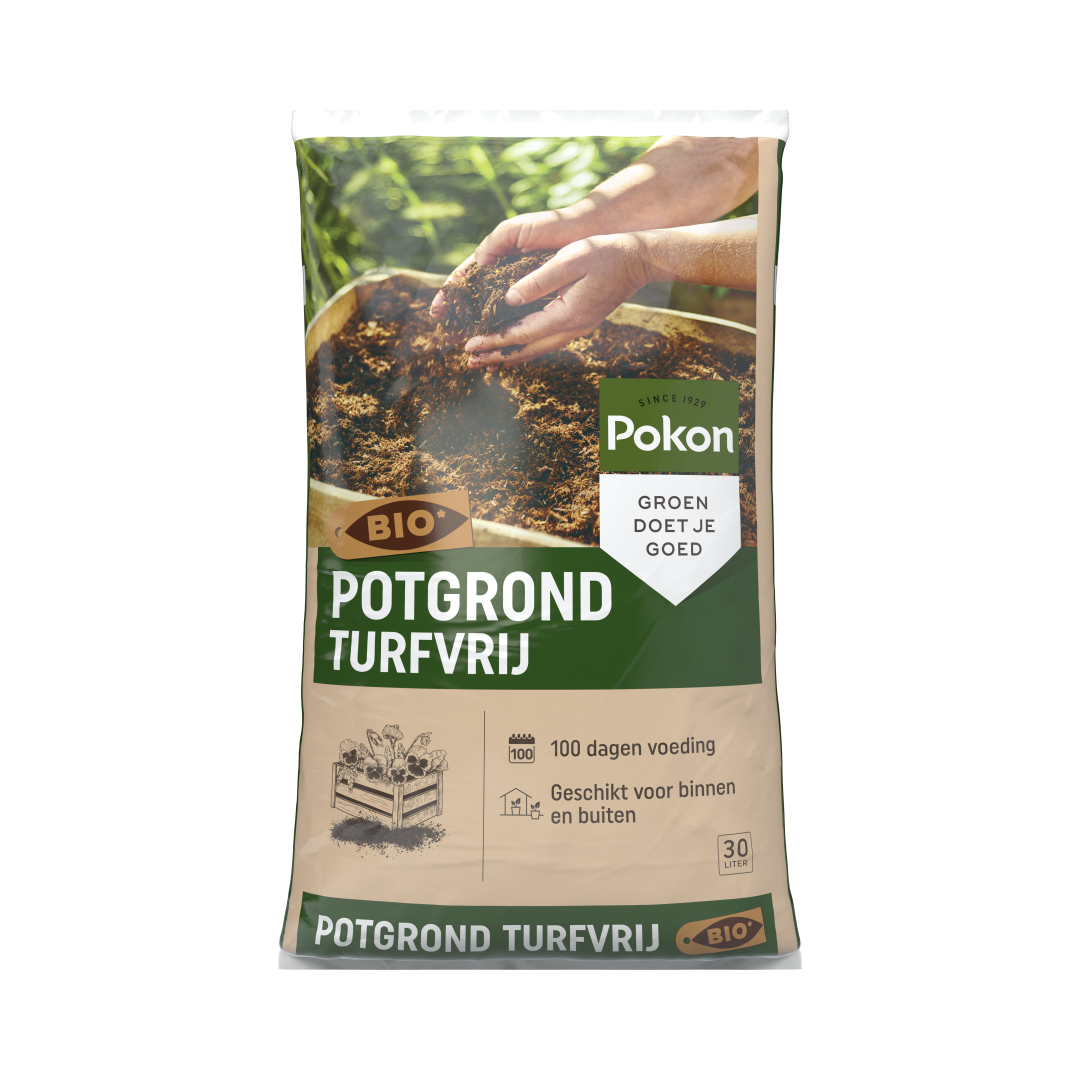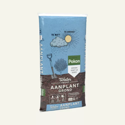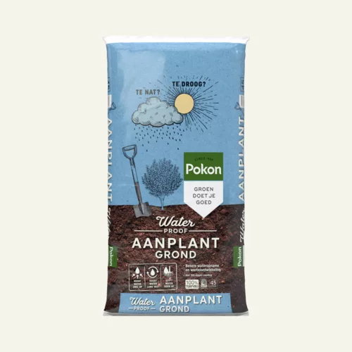 Een tuin met voldoende grond, bomen en planten draagt als waterbuffer bij aan het tegengaan van wateroverlast. Pokon Waterproof Aanplantgrond gebruik je om je border te verbeteren of je tuin te vergroenen door er tegels uit te halen en deze te vullen met deze aanplantgrond. Pokon Waterproof Aanplantgrond zorgt ervoor dat water goed wordt opgenomen, vastgehouden wordt en vervolgens wordt afgegeven aan de plant. Deze aanplantgrond is ook nog eens turfvrij, bevat wel voor 100 dagen voeding en heeft een verpakking van 80% gerecycled materiaal.