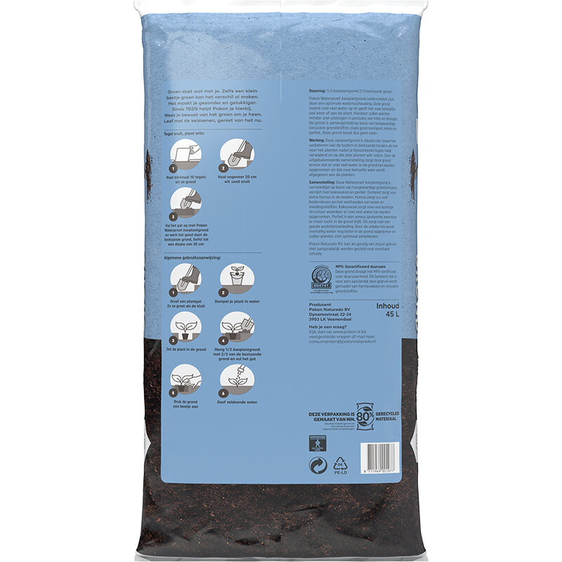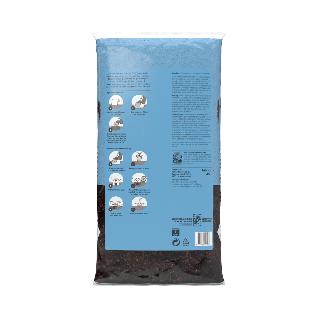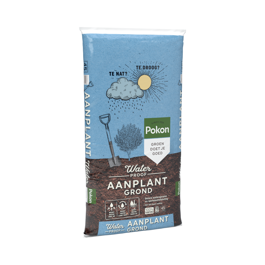 Een tuin met voldoende grond, bomen en planten draagt als waterbuffer bij aan het tegengaan van wateroverlast. Pokon Waterproof Aanplantgrond gebruik je om je border te verbeteren of je tuin te vergroenen door er tegels uit te halen en deze te vullen met deze aanplantgrond. Pokon Waterproof Aanplantgrond zorgt ervoor dat water goed wordt opgenomen, vastgehouden wordt en vervolgens wordt afgegeven aan de plant. Deze aanplantgrond is ook nog eens turfvrij, bevat wel voor 100 dagen voeding en heeft een verpakking van 80% gerecycled materiaal.